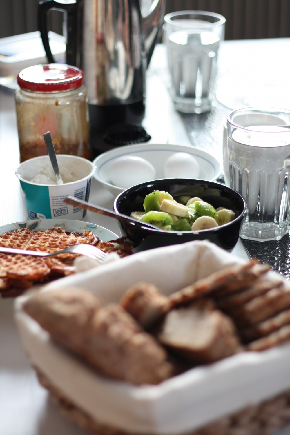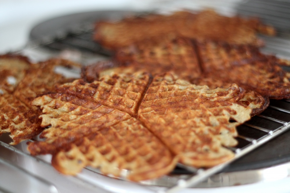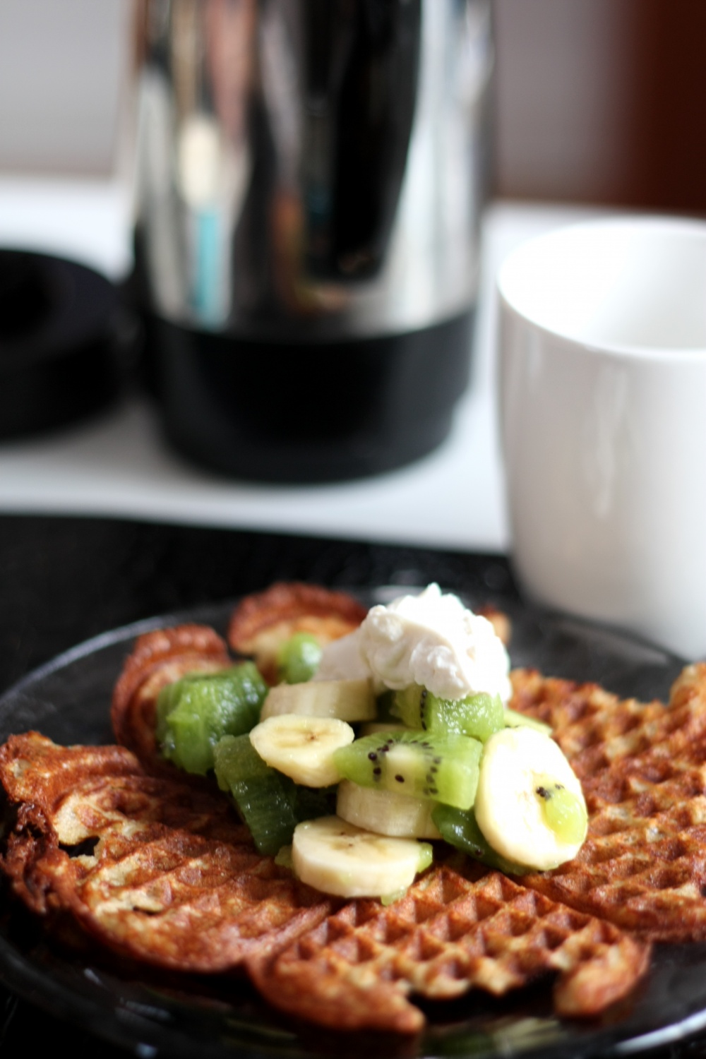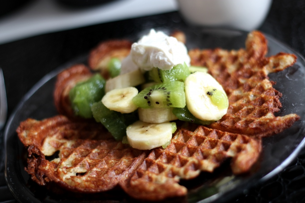 Jag har en viss förkärlek till att experimentera och hitta på nya, lite nyttigare varianter av goda klassiker som bullar, pannkakor eller våfflor. Inte för att det skadar att äta riktiga frasvåfflor nån gång ibland – det är inte det vi äter ibland som spelar störst roll utan det vi äter ofta. Om jag ska äta våfflor till frukost vill jag dock kunna stå mig på dem ett tag, och inte bli hungrig igen efter ett par timmar. Inget sabbar en lördag som en dålig start på dagen. Därför vill jag gärna gå den gyllene vägen – äta mina våfflor och ha havregrynen kvar! Jag vill må bra av den mat jag äter, i kropp och själ, idag och imorgon.