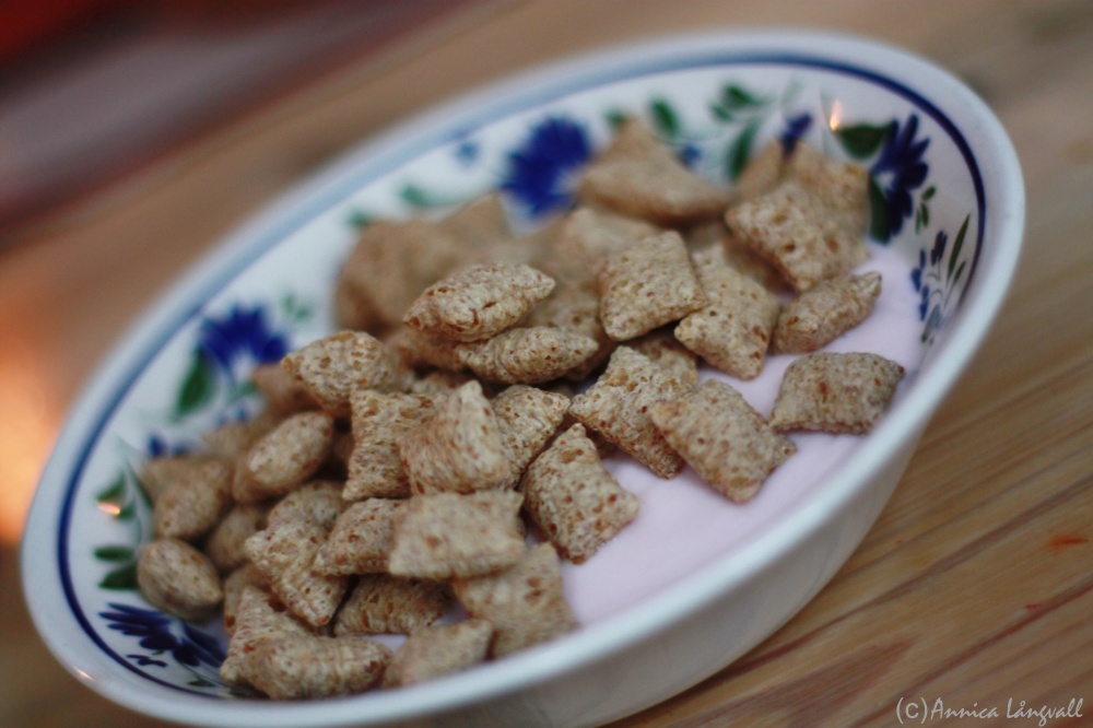 Jag föredrar naturell yoghurt framför sötad. Jag gillar den milda men syrliga smaken, att andra smaker kommer fram framför den söta. En portion fruktyoghurt per dag i en vecka ger dessutom tillsammans ungefär lika mycket socker som en gott&blandat-påse. Att börja varje dag med socker till frukost är inte att rekommendera om du vill hålla blodsockret på en jämn nivå. Men som sagt så kan man äta allt i lagom mängd. Naturell yoghurt är ”ofta mat” för mig medan fruktyoghurt är ”sällanmat”. Såhär till helgen provade jag en fruktyoghurt med hallonsmak. Gott var det, om än inget jag skulle vilja äta varje dag.
