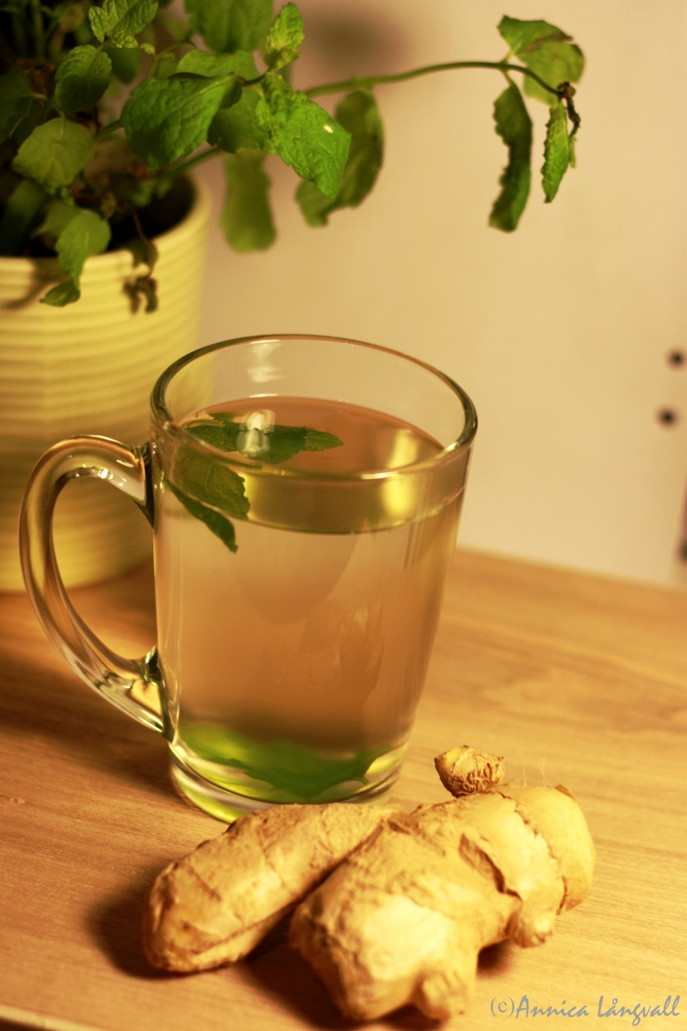 Ett vackert fynd i form av en mugg i glas för 24.90 på coop forum inspirerade mig att koka te ikväll. Jag skalade och skivade en bit färsk ingefära som jag kokade i vatten några minuter. När jag hällt upp drycken i muggen lade jag i några myntablad. Resultatet blev en uppfriskande, värmande och smakfull dryck som kittlar lätt i munnen. På något sätt känns den lugnande. Förr tyckte jag inte om ingefära eftersom doften påminde mig om när jag som liten sprang runt i naturen på våren och stötte på något som förmultnat och gav ifrån sig en frän doft. Det var innan jag provade färsk ingefära tror jag. Den torkade varianten kan slänga sig i väggen, det ska vara färska grejer. Ingefära har använts i tusentals år inom läkekonsten för att behandla allt från inflammationer och ledbesvär till illamående. Huruvida ingefära kan bota några krämpor eller inte lämnar vi därhän och så njuter vi av lite lugn och ro med en kopp gott te – för lite avstressning kan garanterat göra dig friskare.