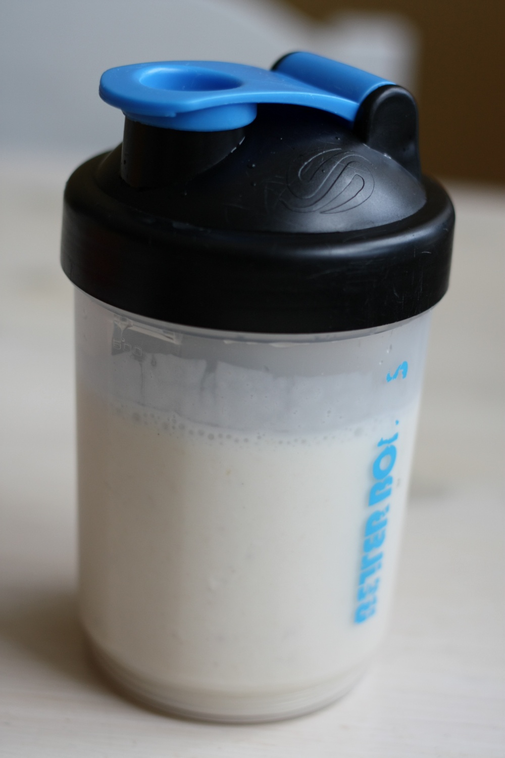 - Mixa alla ingredienser, häll upp i din shaker eller termos och ta med till gymmet.