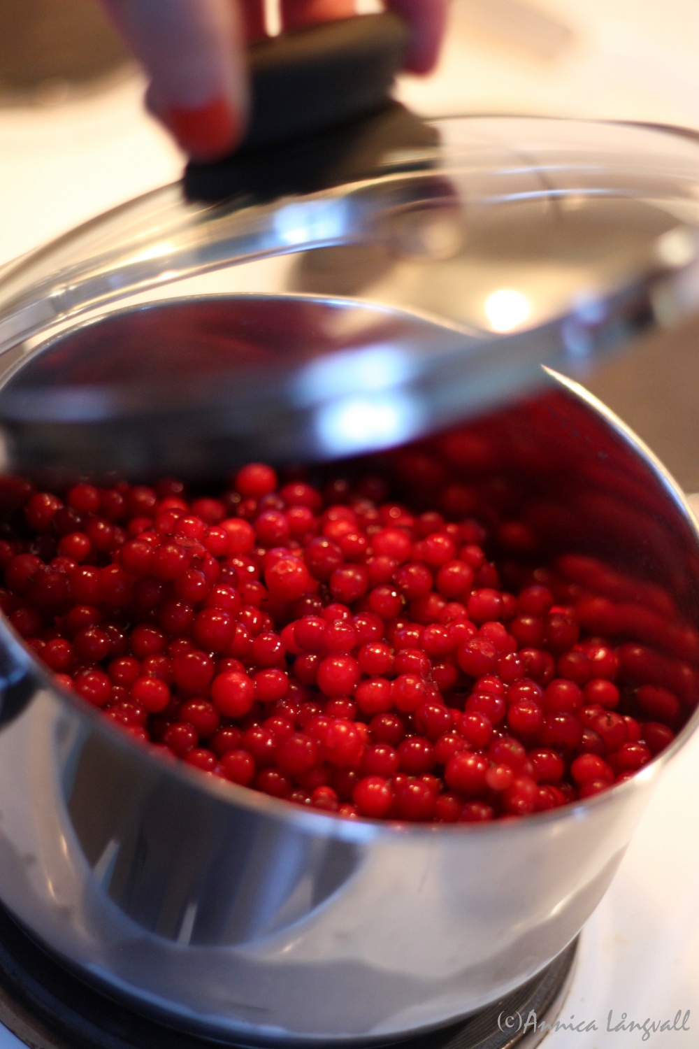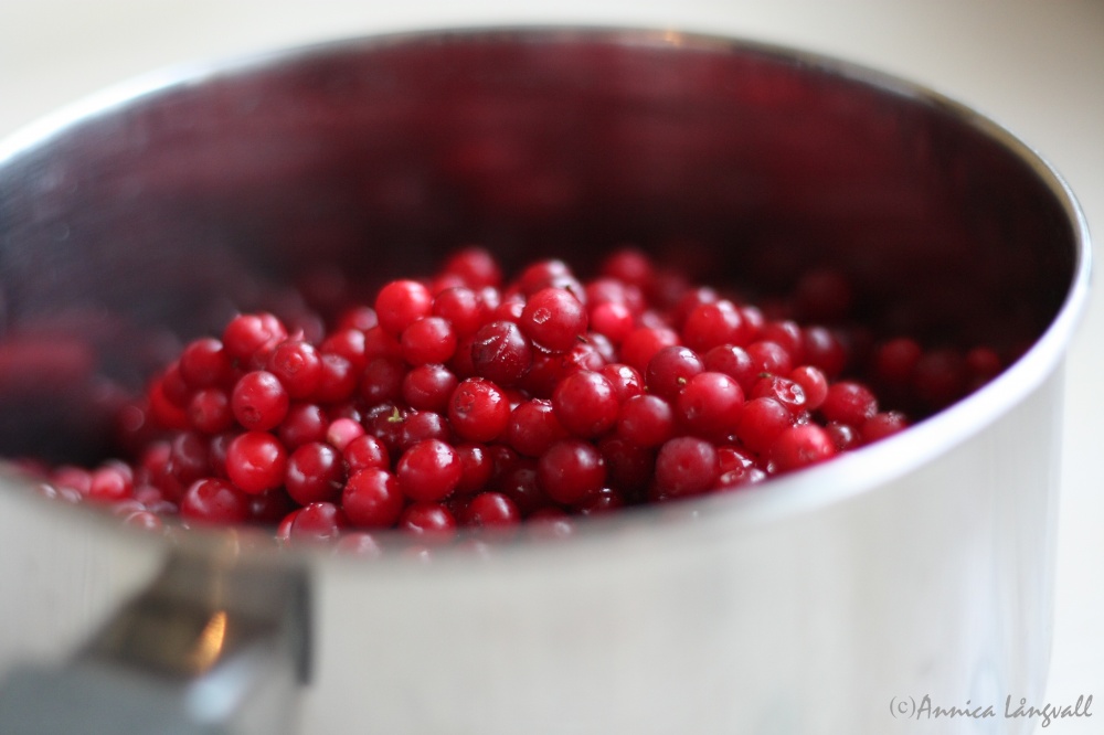 Jag gjorde också egen lingonsylt av 500 g lingon och 300 g socker. Koka lingonen i ca 5 minuter, skumma av, tillsätt socker och koka några minuter till. Häll upp i en ren burk.