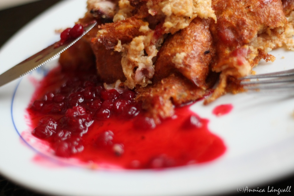 Jag gjorde också egen lingonsylt av 500 g lingon och 300 g socker. Koka lingonen i ca 5 minuter, skumma av, tillsätt socker och koka några minuter till. Häll upp i en ren burk.