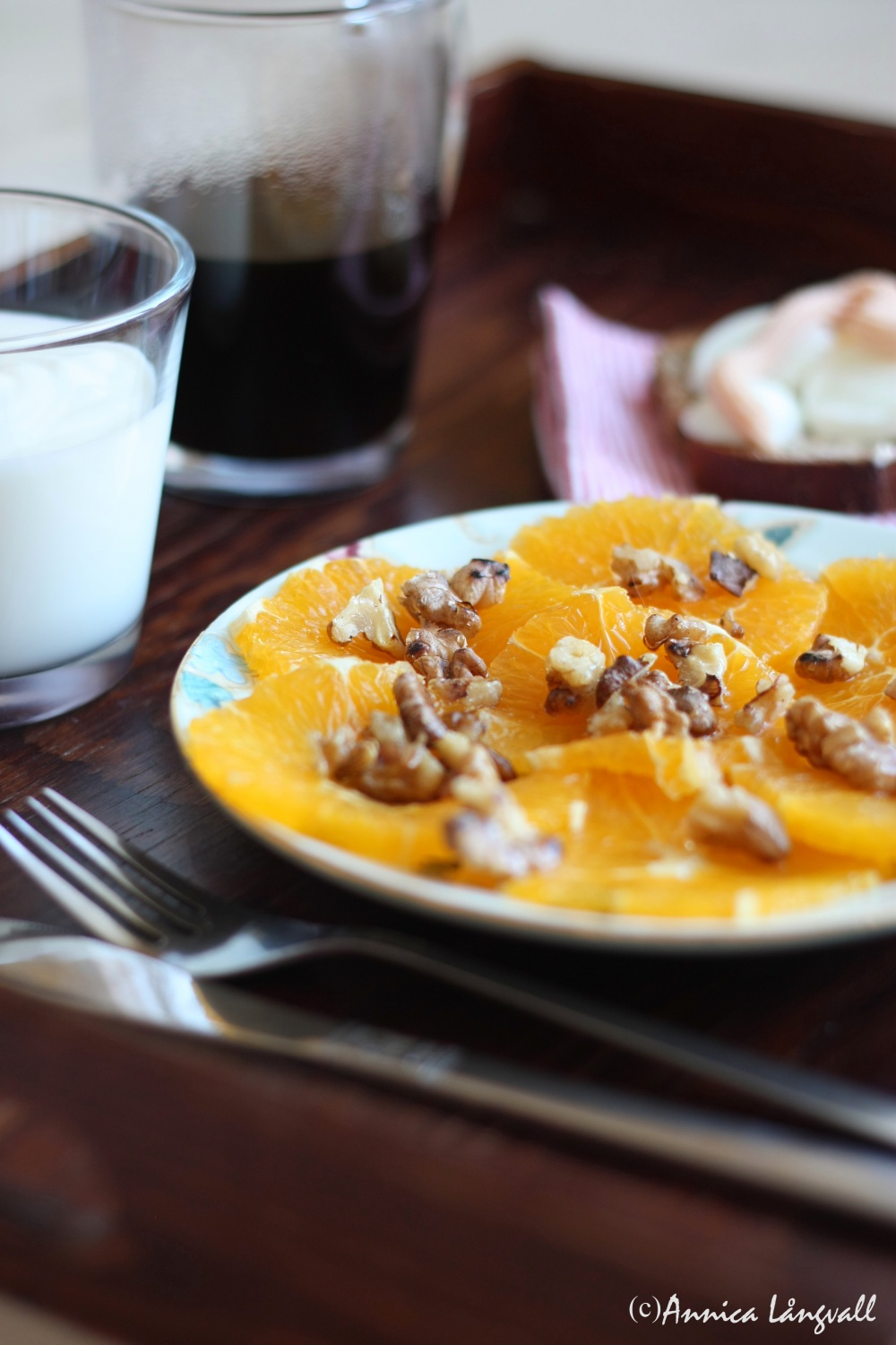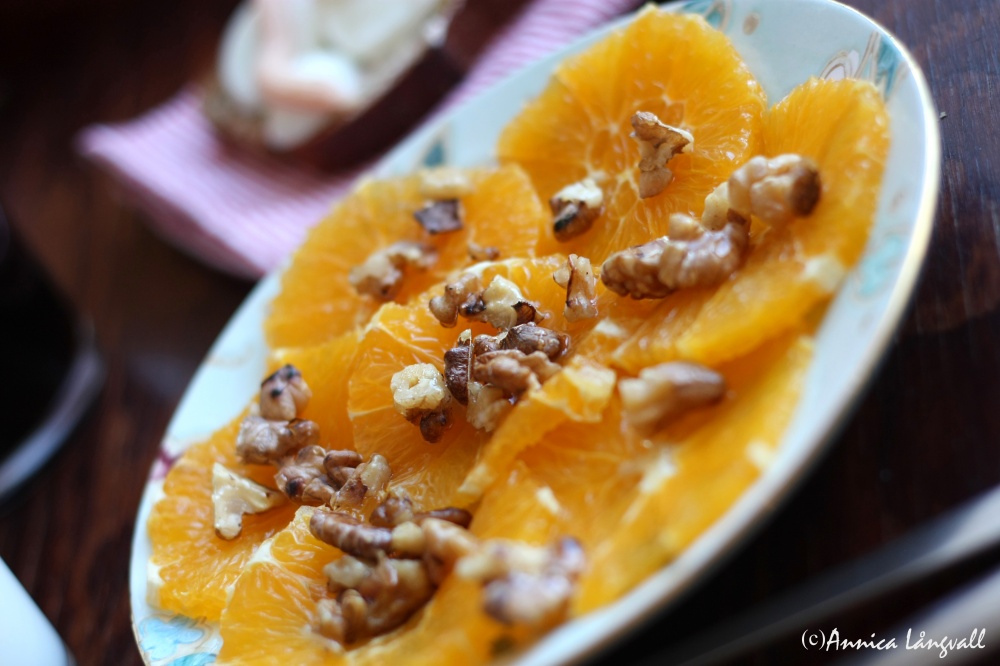 För att fira in helgen ville jag göra något speciellt till frukost. Inspirerad av alla vackra fruktdesserter i kokboken ”Sött, Sweet, Dulce” Bergenström, som min älskade sambo köpte åt mig på bokrean, högg jag tag i apelsinerna i fruktskålen. Det hela slutade med något som jag skulle vilja kalla ”Apelsincarpaccio”. Denna enkla anrättning passar både som frukost, mellanmål eller som en enkel vardagsdessert.