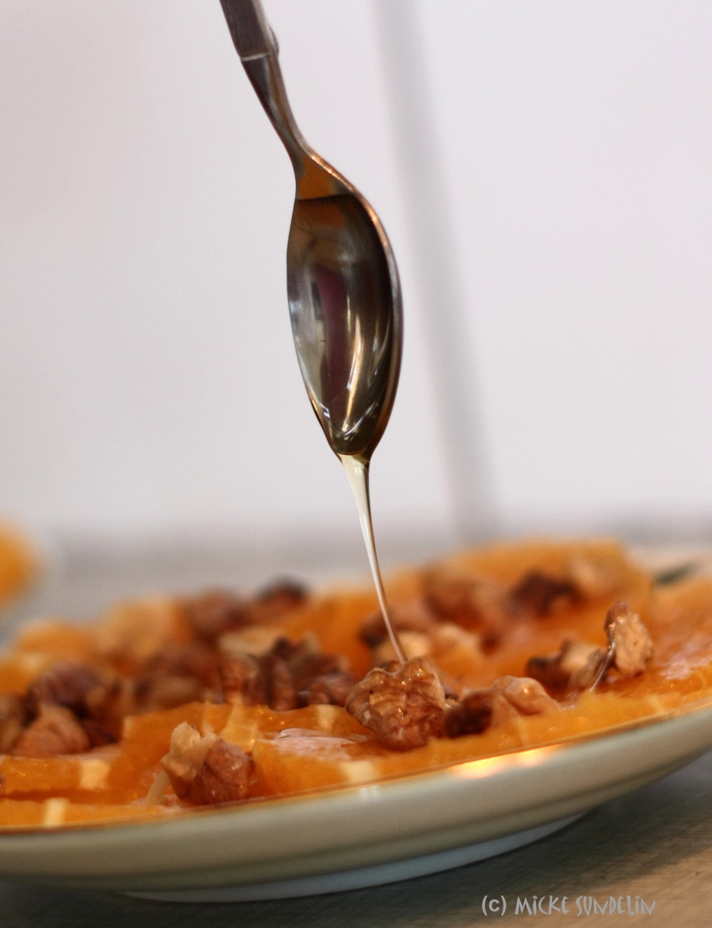 Ringla lite, lite flytande honung över apelsinskivorna. Klart. Inte så svårt, inte så avancerat, men en fröjd för ögat.