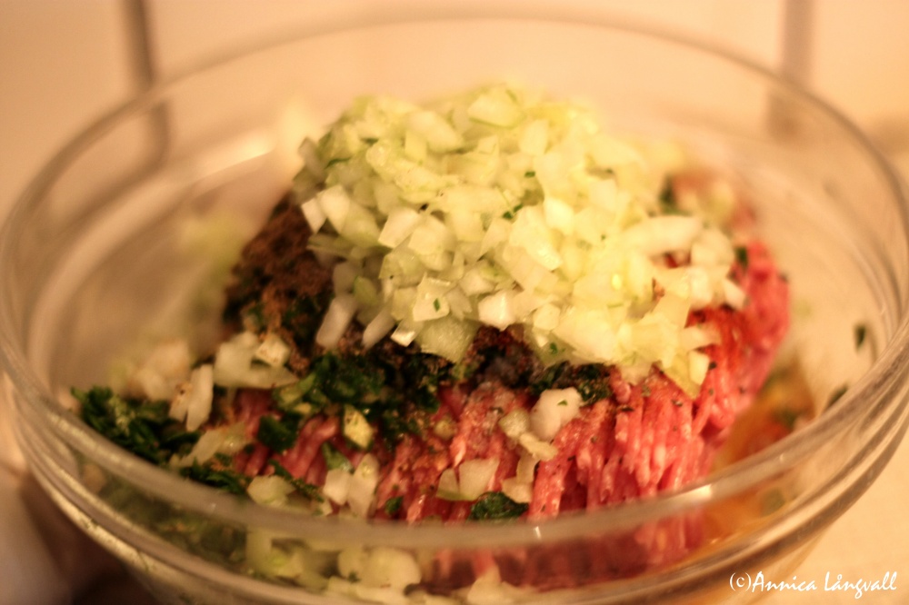 - Skala och finhacka gul lök och vitlök. Skölj och finhacka persiljan. Lägg alltsammans i bunken med köttfärs. Tillsätt övriga ingrediernser och blanda samman till en smidig färs.