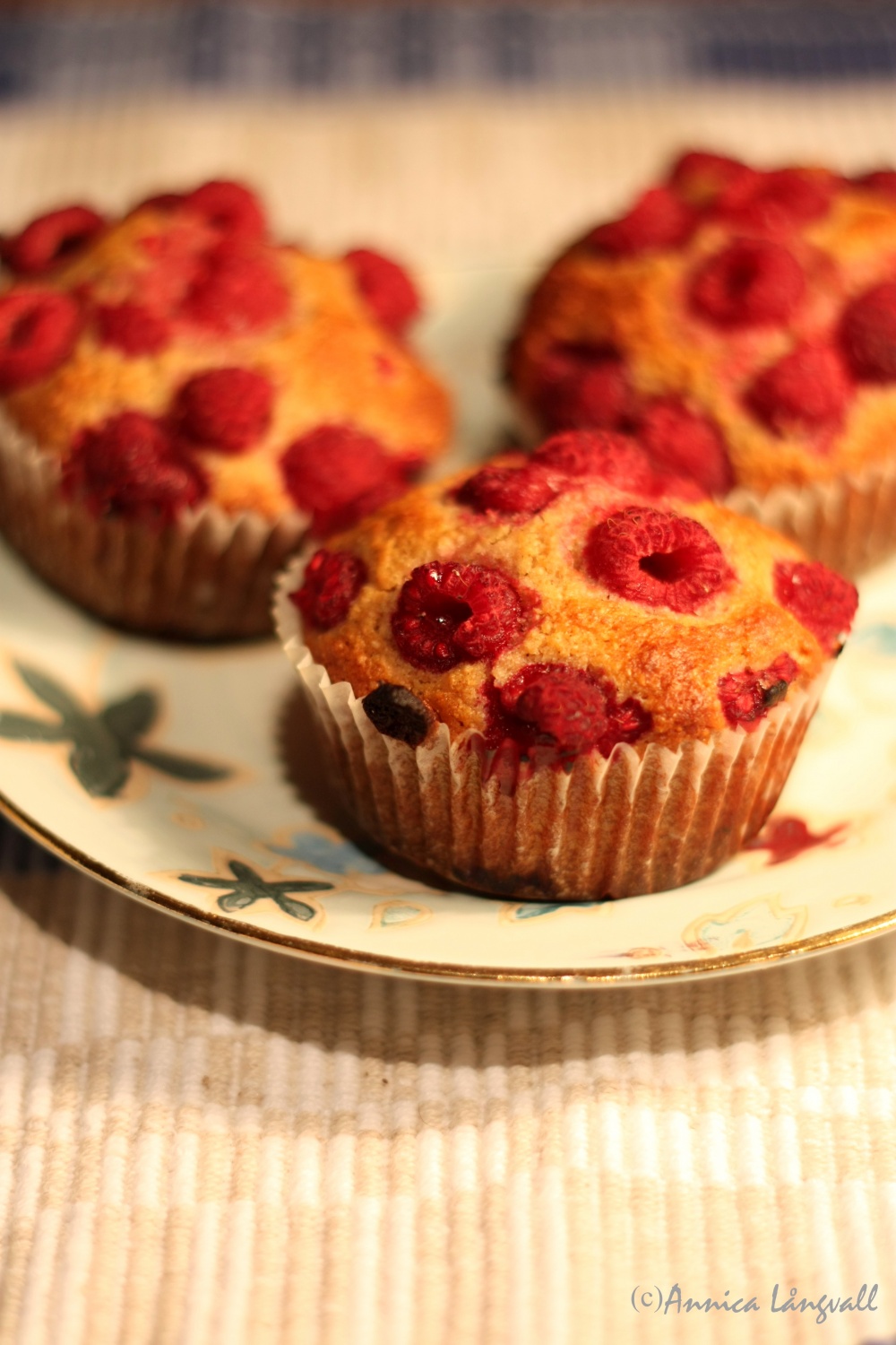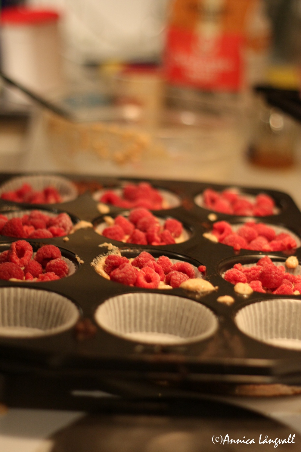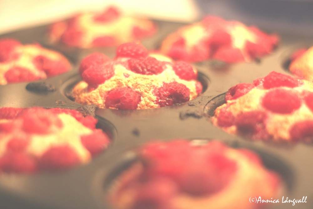 - Blanda alla ingredienser utom hallonen och rör till en jämn smet. Klicka smeten i formar och lägg på hallonen. Grädda mitt i ugnen i 15–20 minuter.