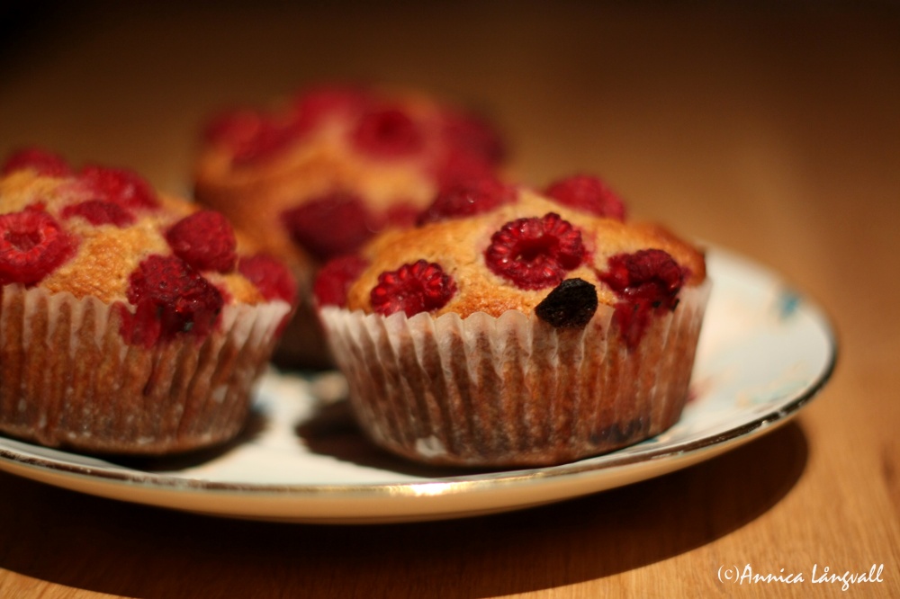 Ni som läst bloggen ett tag vet ju att jag gillar att mixtra med olika mjöl och testa nyttigare och annorlunda varianter av olika saker. Den här gången fick vetemjölet stiga åt sidan och lämna plats för grahamsmjöl och så har jag toppat muffinsen med en riklig mängd hallon. De här muffinsen är inte lika söta som vanliga muffins, men om man lägger bort förväntningarna på att de ska vara så hiskeligt söta, så är de riktigt goda. Massor av vackra hallon toppar de små bulliga muffinsen så att de för tankarna till tuvor och kullar fyllda av bär.