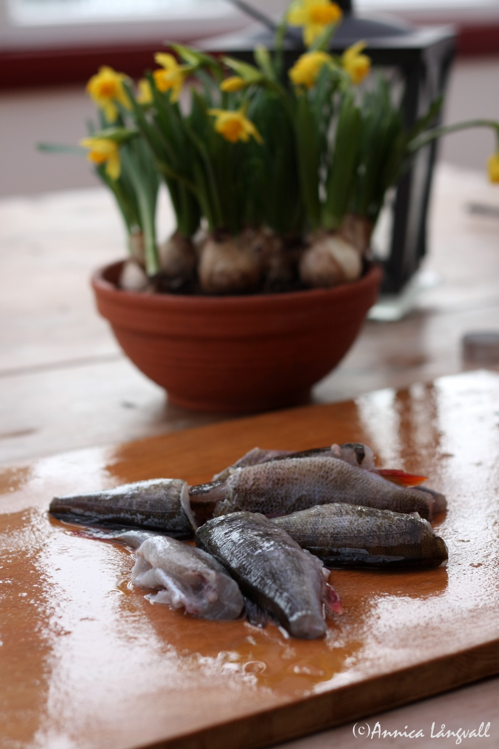 Imorse vaknade jag upp i ett soligt Rossön hos mina svärföräldrar. På förmiddagen tog vi skotern ut på isen och pimplade, och jag drog upp några abborrar. Det var ett tidskrävande arbete att filéa de små, hala firrarna, och jag gjorde säkerligen av med med energi för att fiska upp och tillaga fiskarna än vad jag fick ut av att äta dem, men det gav energi till själen. På vardagar lagar jag oftast mat som går snabbt att laga, men så ibland kommer de där tillfällena i livet då jag behöver ”meditera”, och då gillar jag att göra såna här tidskrävande saker i köket.