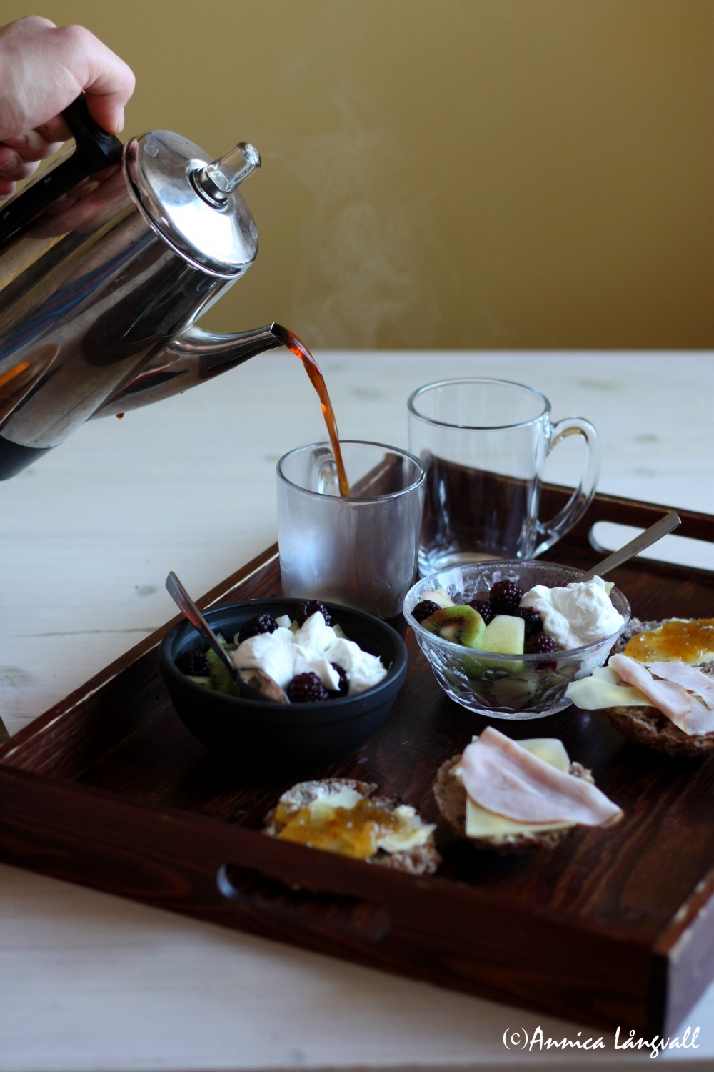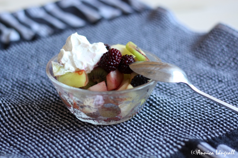 För att en frukost ska kännas sådär lyxig och uppiggande ska den innehålla frukt eller bär enligt mig – helst både och! Det blir både vacker, hälsosamt och gott. I helgen blev jag så otroligt sugen på melon, så på lördagsmorgon bjöd jag älsklingen på en fruktsallad med cantaloupmelon, kiwi, päron och björnbär. De mörka björnbären lyste som svarta diamanter, som kronan på verket. Olika frukter och bär innehåller olika näringsämnen och genom att blanda och variera det du äter ökar du chanserna att få i dig de vitaminer och mineraler kroppen behöver.