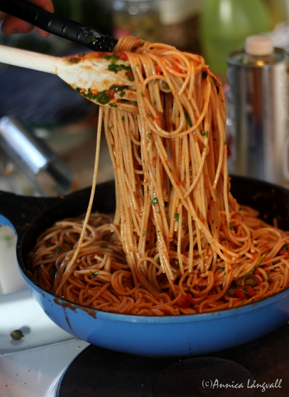 - När pastan är klar, tillsätt hackad persilja och blanda ihop tomatsåsen och pastan.