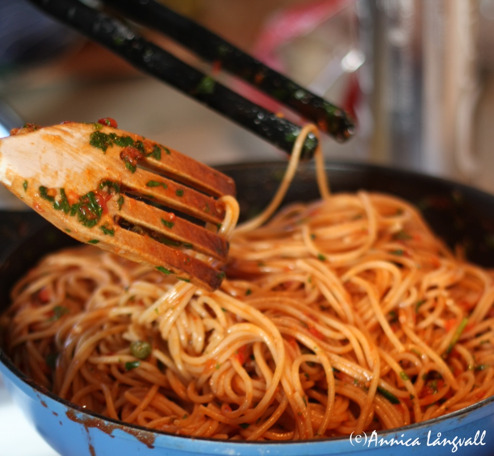 Ibland är det det allra enklaste som får smaklökarna att dansa tango i munnen. Pasta puttanesca, eller ”slampans pasta” sägs vara ha fått sitt namn för att det går så enkelt och snabbt att laga till att man kan göra det ”mellan två kunder”. En annan teori är att namnet kommer av att ingredienserna är sådana som man kan ha hemma i skafferiet och därför inte behöver gå och handla så ofta – än en gång, ”mellan kunderna”…