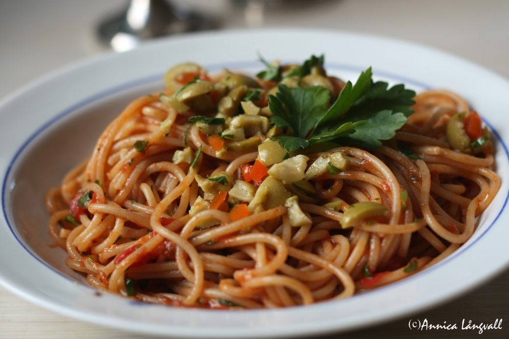 Jag serverar ibland pastan med oliverna vid sidan om, då inte alla har hittat sin kärlekshistoria till oliver – än… Jag kan dock försäkra att även några av dem som varit tveksamma till oliver har uppskattat oliverna till denna rätt när jag lagat det. Så prova! Även om du inte är frälst olivälskare så kanske du upptäcker en ny kärlek i denna rätt. Självklart kan du tillsätta mer chili om du, som jag, gillar het mat!