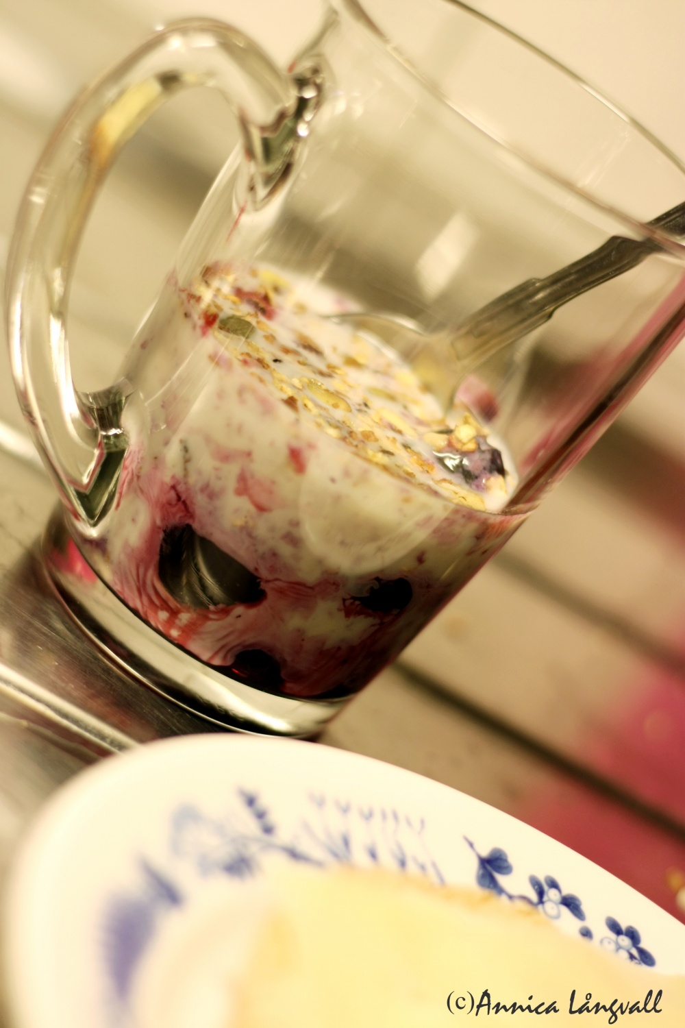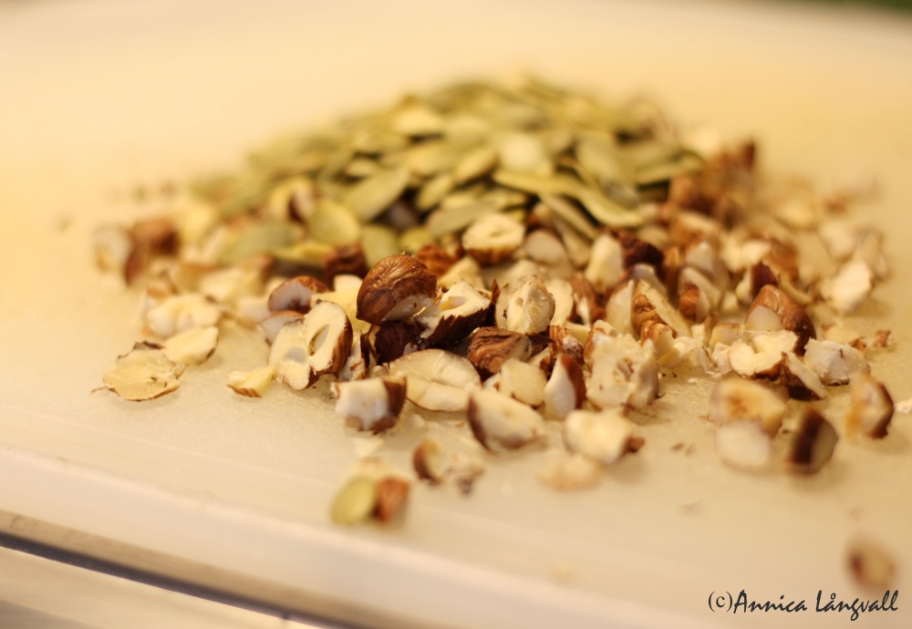 Jag har hittat en ny mellanmålsfavorit! Idag gjorde jag egen müsli av fiberhavregryn, riven kokos, hackade hasselnötter, russin, osvavlade aprikoser och pumpakärnor, allt rostat med lite honung i stekpannan i mitt lilla kök. Från frysen fiskade jag upp en blandning av blåbär, hallon, körsbär och vinbär som jag tinade i en mugg. Tillsammans med en skvätt vaniljsmakande sojamjölk blev det en ny mellanmålsfavorit!