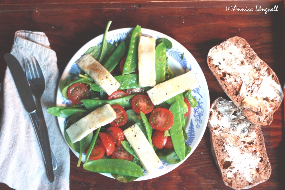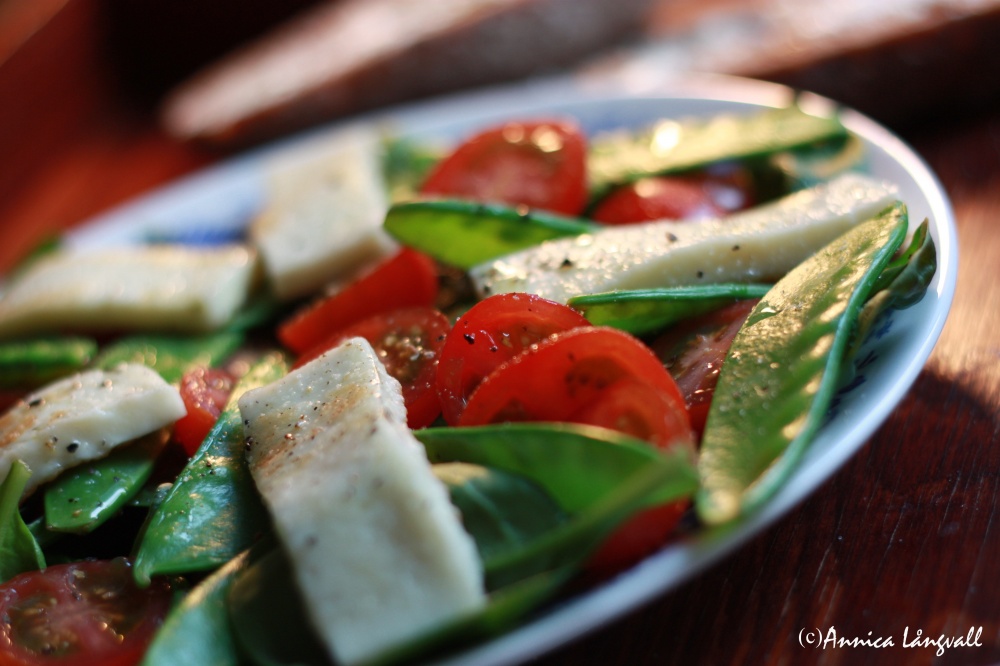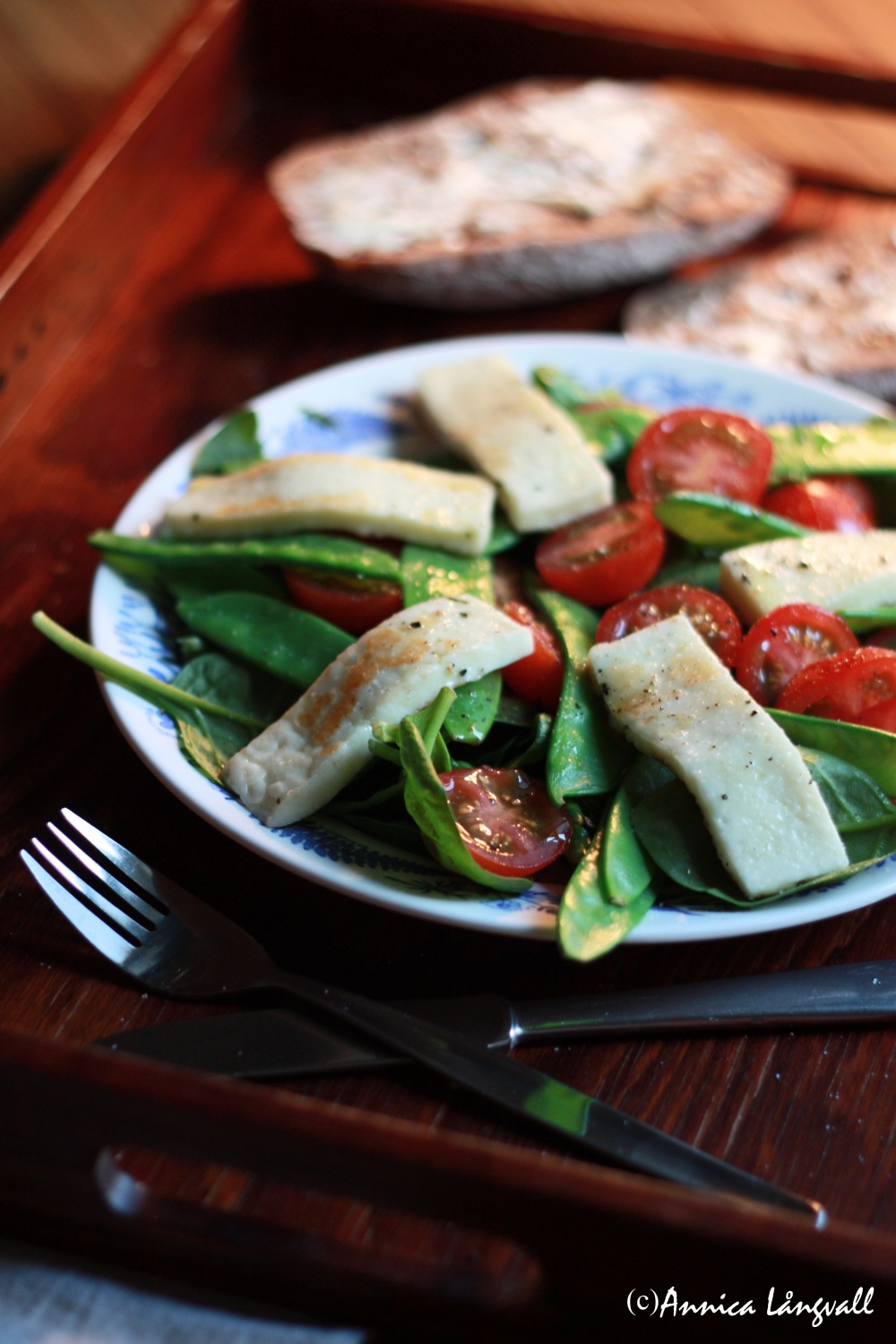 En sallad med bladspenat, sockerärter, körsbärstomater och halloumi kändes helt rätt en sån här härlig vårdag. Ånga sockerärtorna lite kort i pannan innan du lägger i halloumin så får du fram en otroligt vacker grön färg. Toppa salladen med olivolja, svartpeppar och gärna lite flingsalt om du har, annars brukar jag ta lite vanligt salt. För att göra det hela lite matigare och ladda kroppen med kolhydrater som så väl behövs när man tränar så serverade jag den vackra salladen till mig själv med ett gott bröd. Dessutom blev det mango, jordgubbar och sojachokladpudding till kaffet på maten!