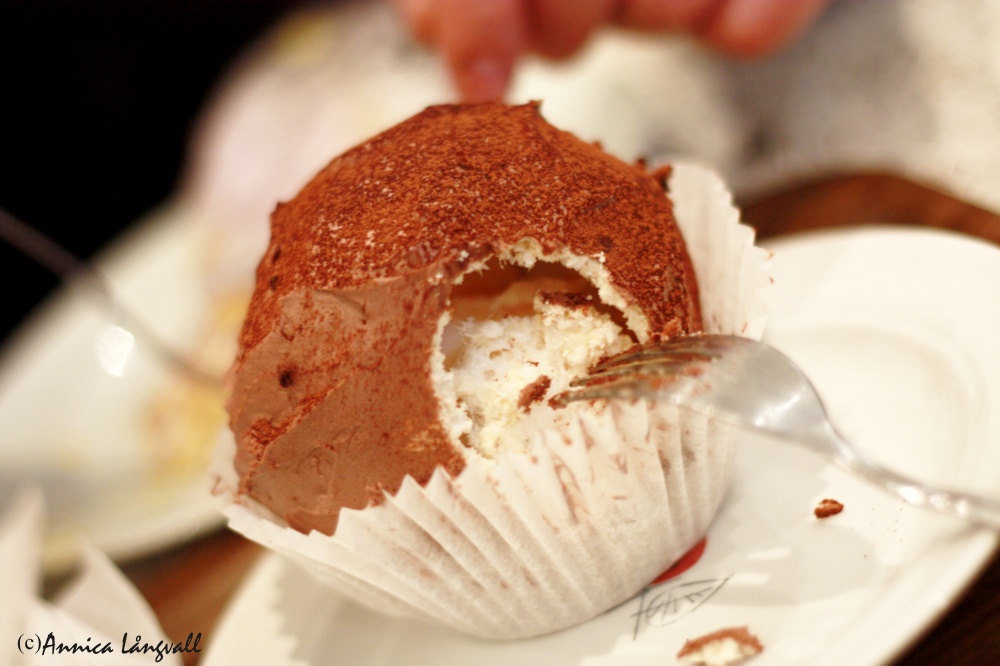 Sedan delade vi på en ”Killevip”, en underbar maräng täckt med någon chokladaktig kräm som smakade sjukt gott. Marängen hade en frasigt yttre med kletig insida, och inuti fanns en klick med grädde! Rekommenderas! Det är roligt det där med bufféeffekten: när man får stå på konditori och välja bland tiotals goda bakverk och desserter så känns allt tusen gånger godare, redan när man står och väljer, än om det bara funnits en sort att välja mellan.