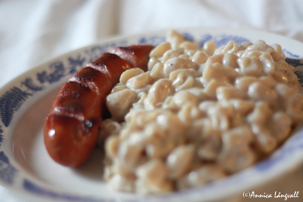 Till middag blev det stuvade fullkornsmakaroner med frukostkorv och tomater som jag värmt i mikrovågsugnen. Ett tips för att lyckas stuva fullkornsmakaroner är att reda med lite mjöl. Annars verkar det inte bli riktigt bra.