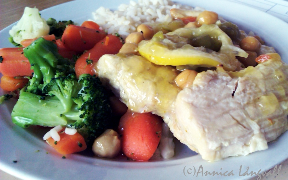 Såhär lagar de maträtten hos oss på kostenheten. Jag har inte själv lagat rätten hemma än, så kom gärna med kommentarer på receptet om ni testar det, eftersom det ju ibland är lite annorlunda att laga 4 portioner istället för 400… Kom ihåg att välja ekologiska citroner till de maträtter där du ska använda skalet. På så sätt slipper du krydda maten med bekämpningsmedel.