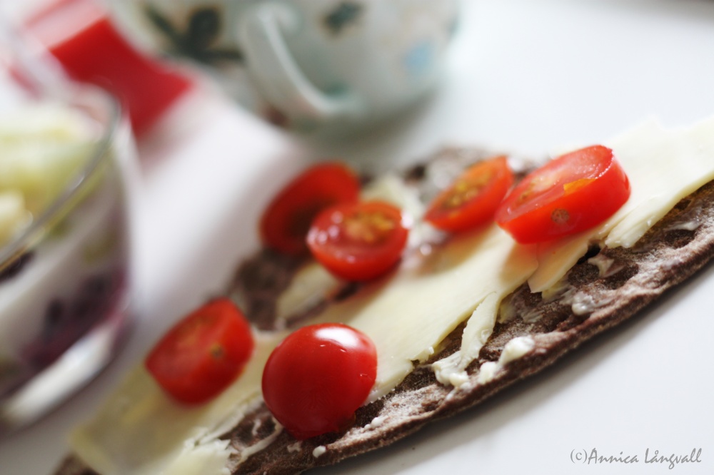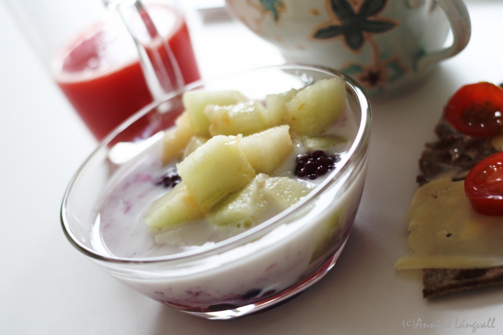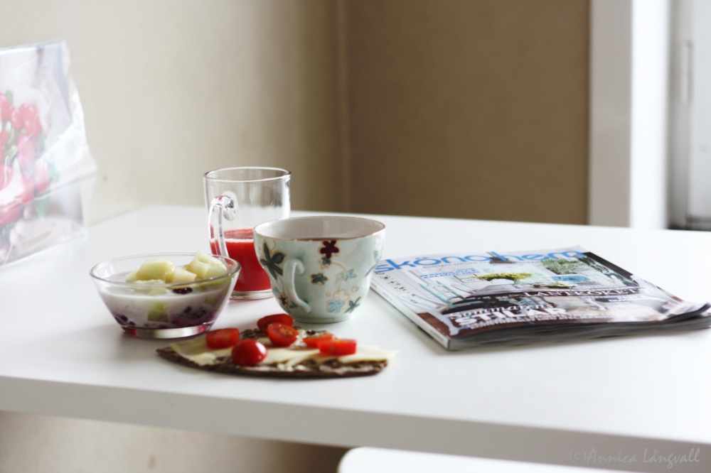 En så stor dag kräver såklart en god frukost: bär från frysen fick blanda sig med piel del sapo-melon och laktosfri mjölk; leksands fäbodknäcke med surdeg fick sällskap av bregott, ost och körsbärstomater. En kopp Bangalore Palace-te fick ersätta mitt älskade morgonkaffe då kaffemaskinen ännu inte anlänt. Ett glas ljuvligt frisk apelsinjuice på det, senaste numret av Sköna Hem och regn utanför fönstret. Inte så dumt.