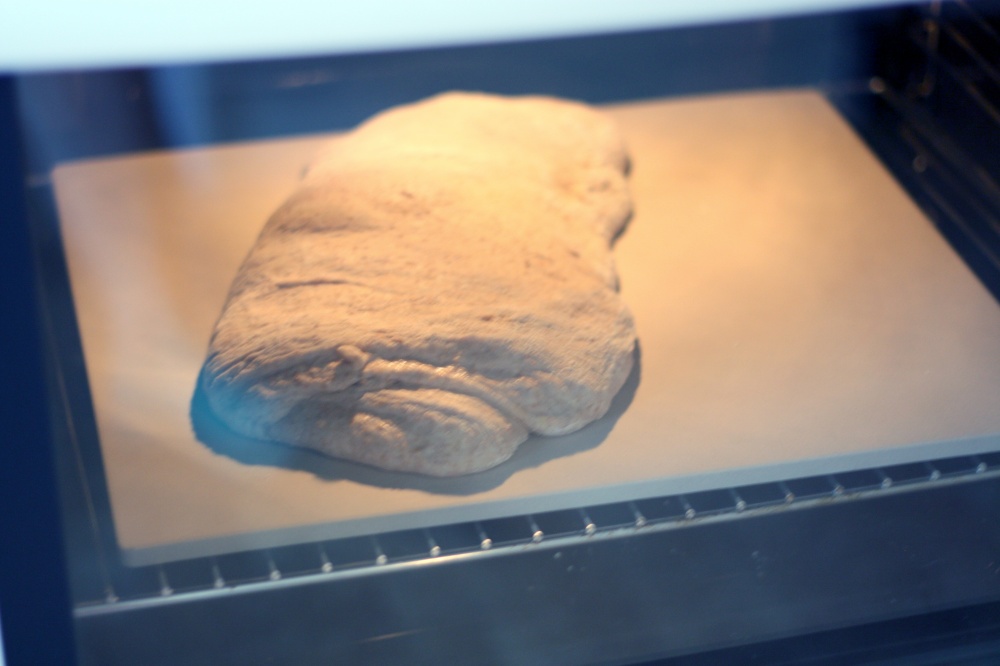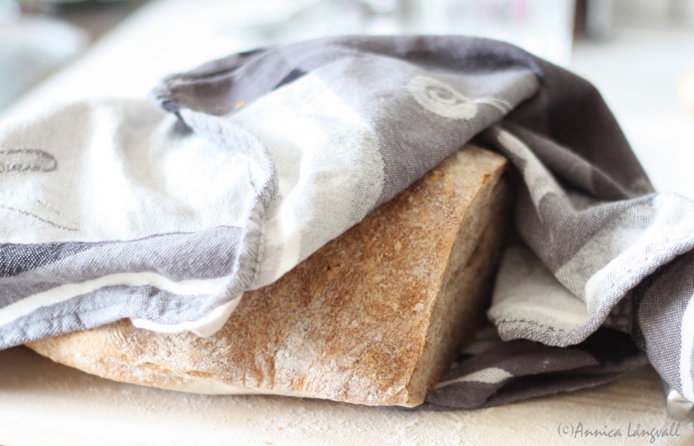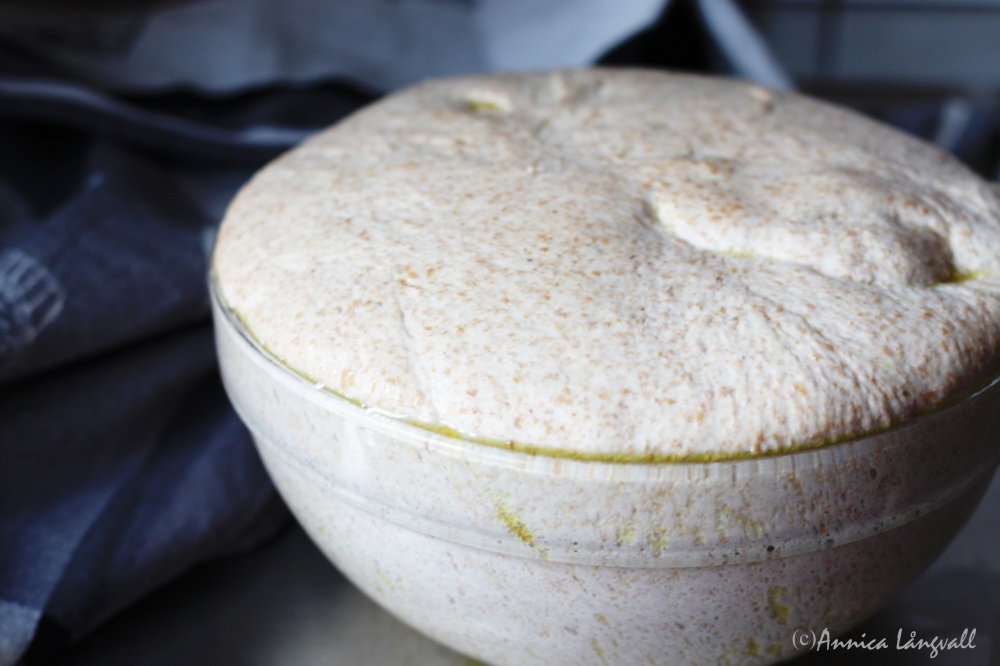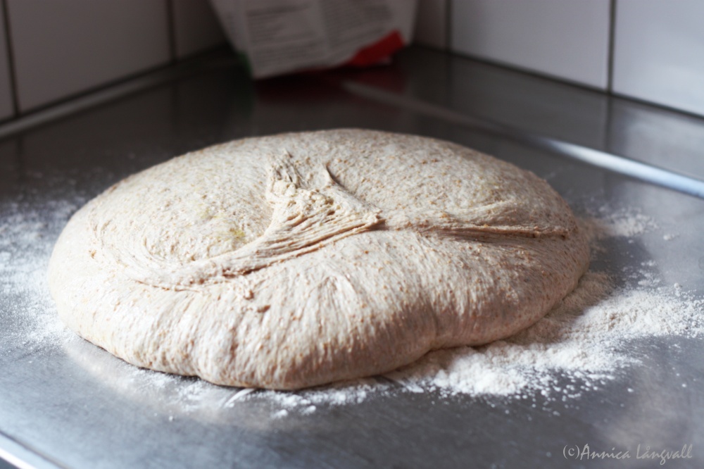 Brödet bakade jag av rågsurdeg, fullkornsdinkelmjöl, lite grahamsmjöl, vetemjöl special och salt. Degen fick sedan jäsa i en skål insmord med olivolja. Några gånger under jäsningen tog jag tag i degens kanter och vek dem in mot mitten så att degen spändes. Detta skapar ”hål” i brödet.