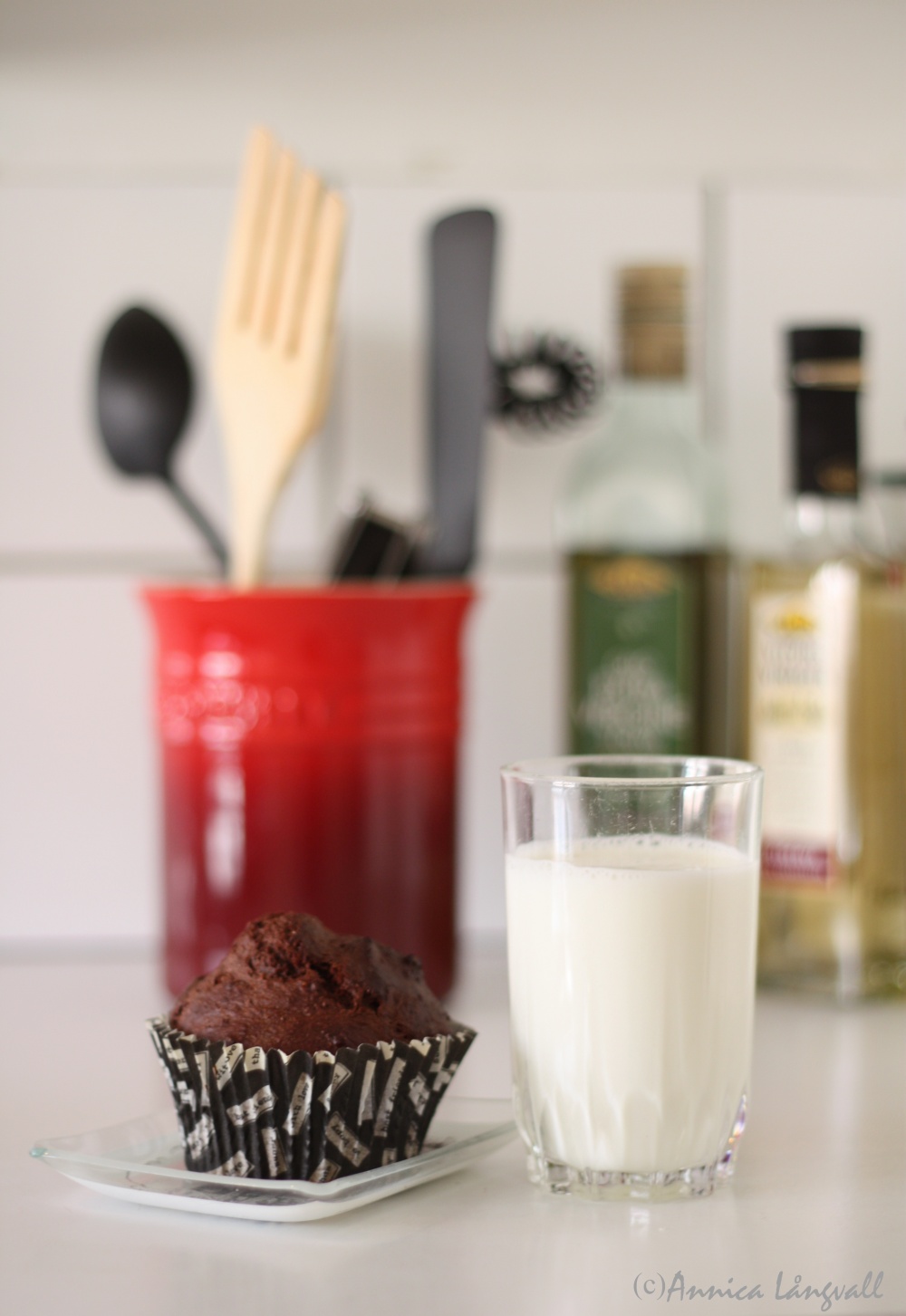 Så när vi nu börjat prata om kvalitet på kolhydraterna så vill jag presentera mina nyttiga chokladmuffins! De är som en blandning mellan bröd och bakverk; en doft av choklad, men utan den förväntade sötman. Ett bra alternativ för den som vill dra ned på sockret. Tillsammans med ett stort glas mjölk är de en hit efter ett träningspass. De har tyvärr en förmåga att fasta i muffinsformen, därför kan det vara en bra idé att grädda dem i en smord muffinsplåt.