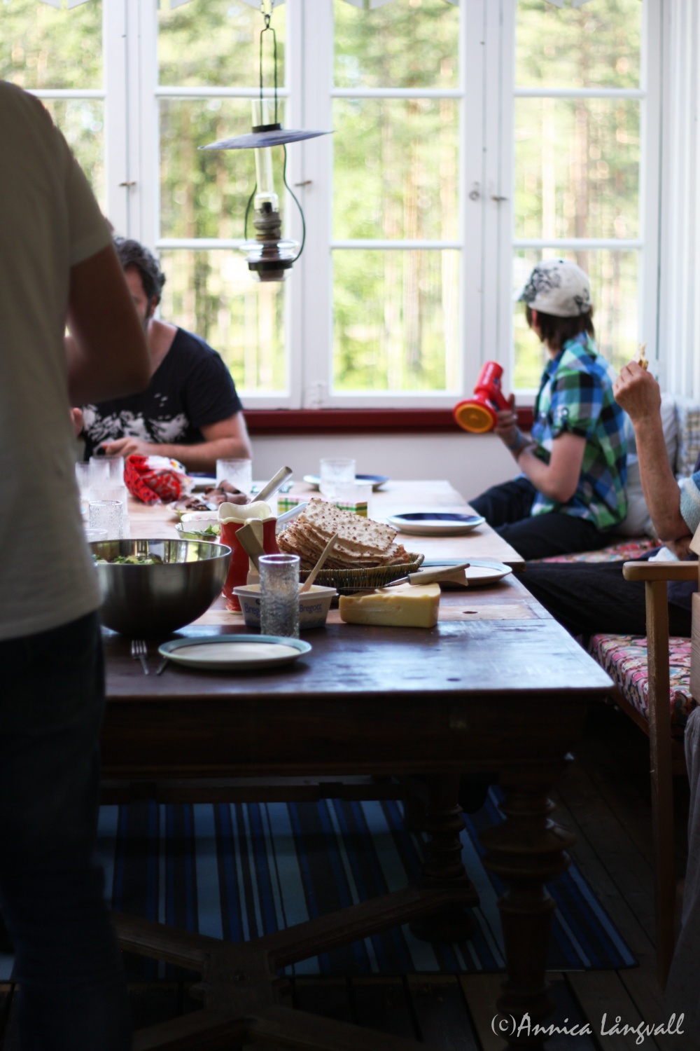 Lokalproducerat när det är som bäst: en junimiddag i Rossön tillsammans med familjen. Vi firade att min yngsta svägerska Lina nu gått ut grundskolan, hipp hipp hurra för dig Lina, din framtid är ljus! På bordet fanns tjälknöl av älg som en gång sprungit i Rossöns skogar, sallad med ruccola som odlats i växthuset på gården, en underbar fransk potatissallad med ”krypern” (mandelpotatis) från byn och gräslök som vi hämtat från en tuva nära potatissalladen. Här i Rossön är närodlat och lokalproducerat en naturlig del av vardagen, och inte det svåruppnåeliga ideal vi ibland betalar dyrt för i stan. Husen omringas inte av asfalt och gallerior, utan av gröna gräsmattor, potatisland, skogar med vilt och vatten med fisk.