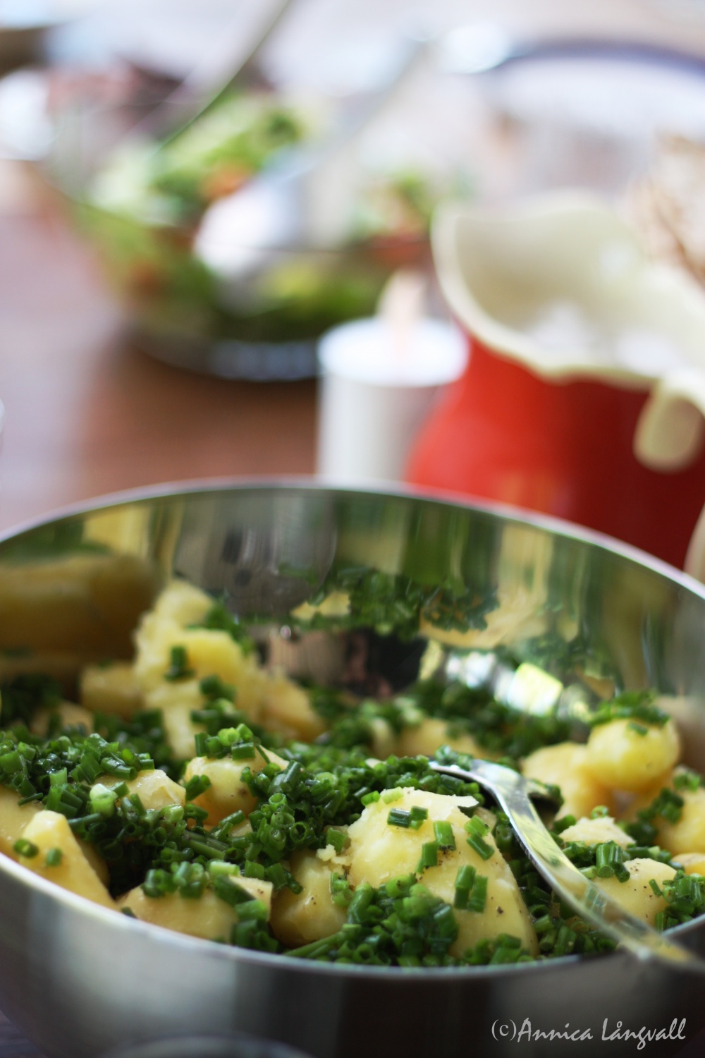 - Blanda ihop alla ingredienser till såsen, slå den över den varma potatisen och servera potatissalladen ljummen.