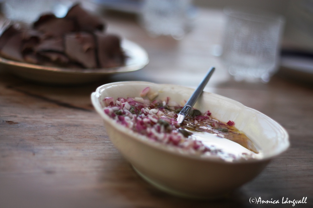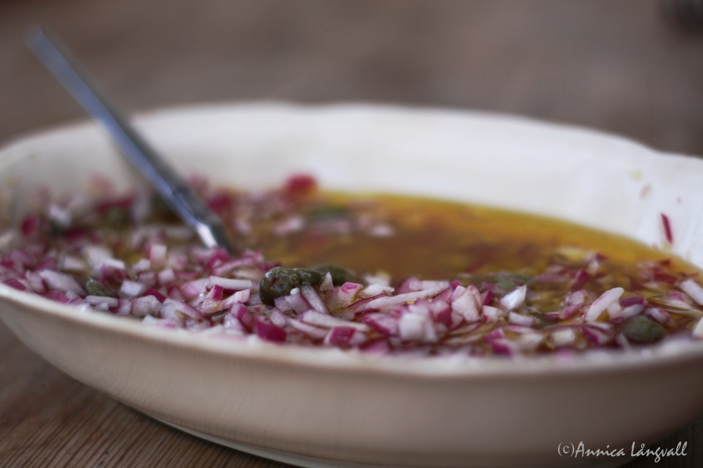 - Blanda olja,vinäger, kapris och rödlök. Häll marinaden över tunnskivad stek eller tjälknöl.