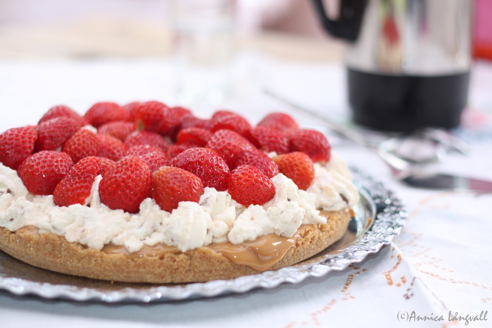 Receptet är vinnaren i Buffés tårttävling, och är skapat av Sara Marteus. Tårtan är så otroligt sliskig att den nästan kräver en varningstriangel, men i en liten lagom bit är den fantastiskt god och lämnar ingen sötsugen besviken. Vi som njöt av tårtan i midsommar var överens om att jordgubbarna är oumbärliga för att bryta av det söta med lite syrlighet.