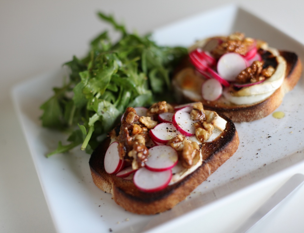 - Ta ut toasten ur ugnen och toppa med valnötter och rädisor. Lägg upp toasten på en tallrik. Lägg ruccolasalladen i en liten hög bredvid, ringla över lite olivolja och ev. lite balsamico. Riv av några drag med pepparkvarnen och ta ev. en nypa flingsalt.