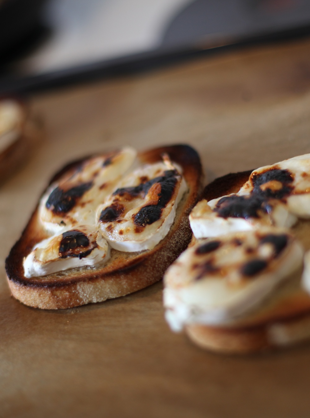 - Lägg chèvre på brödskivorna ( man kan även smöra dem med ett tunt lager smör innan). Ringla över lite honung. Grilla i några minuter tills osten smält och fått lite färg (alltså inte så mycket färg som jag fick…)