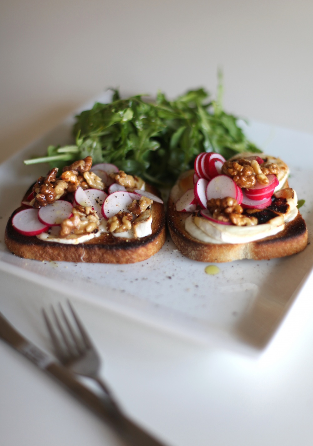 - Ta ut toasten ur ugnen och toppa med valnötter och rädisor. Lägg upp toasten på en tallrik. Lägg ruccolasalladen i en liten hög bredvid, ringla över lite olivolja och ev. lite balsamico. Riv av några drag med pepparkvarnen och ta ev. en nypa flingsalt.