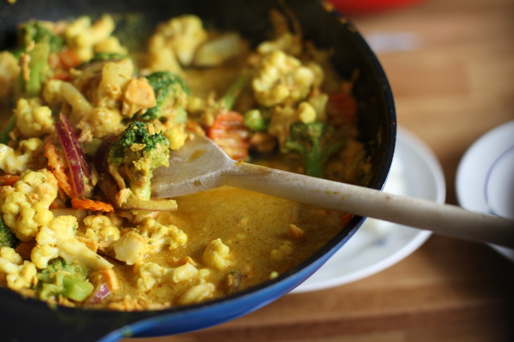 - Woka i några minuter tills köttet är genomstekt. Tillsätt kokosmjölk och krydda med curry, peppar och lite salt. Servera med ris eller nudlar – gärna fullkorn. Snabbt och enkelt!