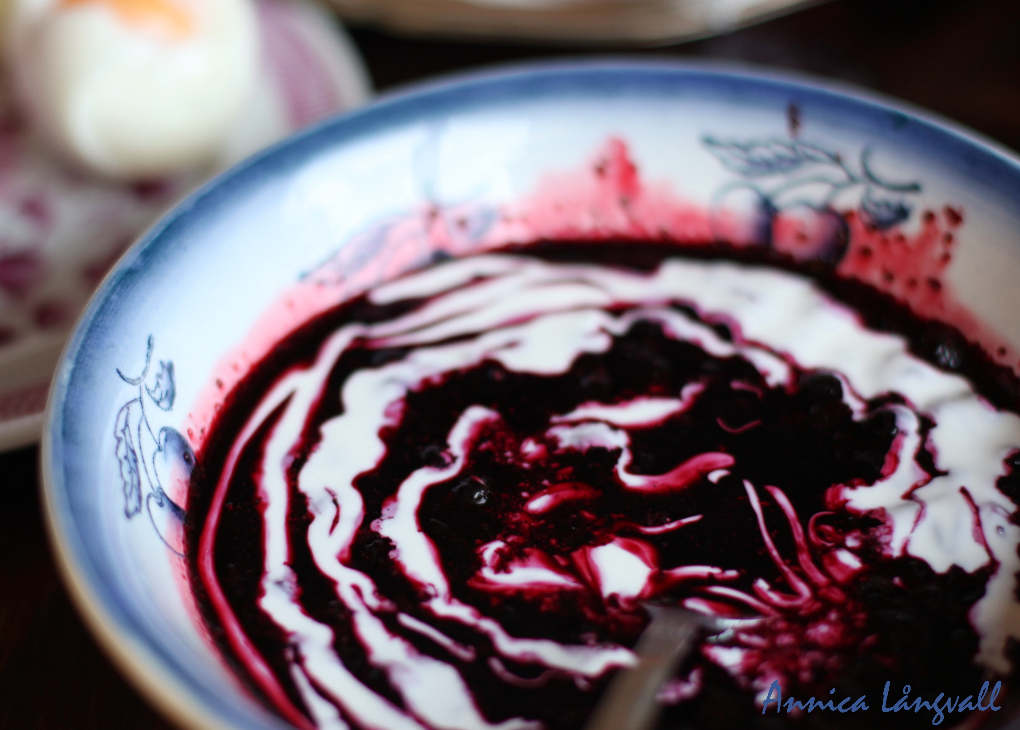 Blåbärssoppa med lite grädde. Lade bär och lite vatten i en skål och kokade i mikron en liten stund. Det svämmade över lite, så nästa gång tar jag en större skål!