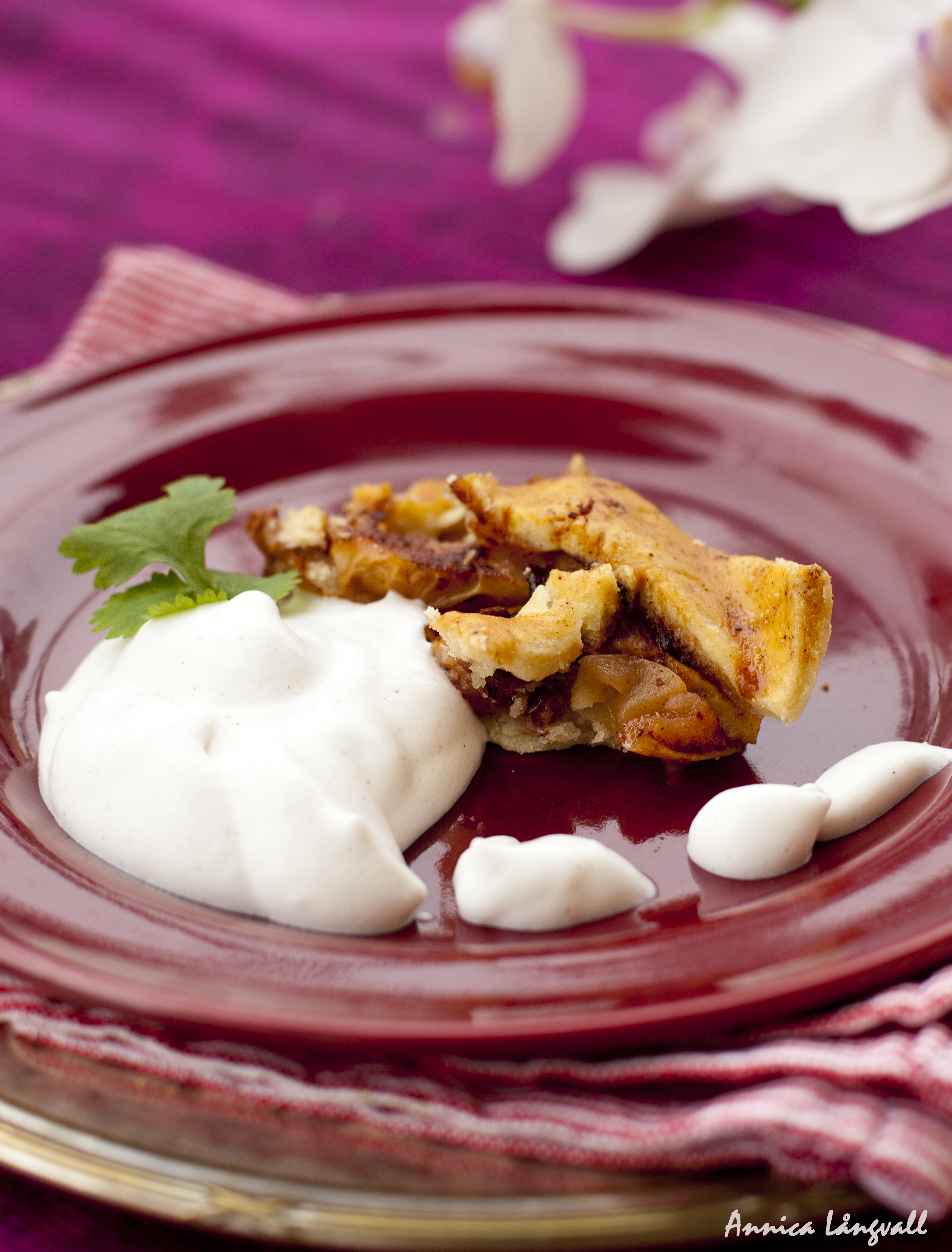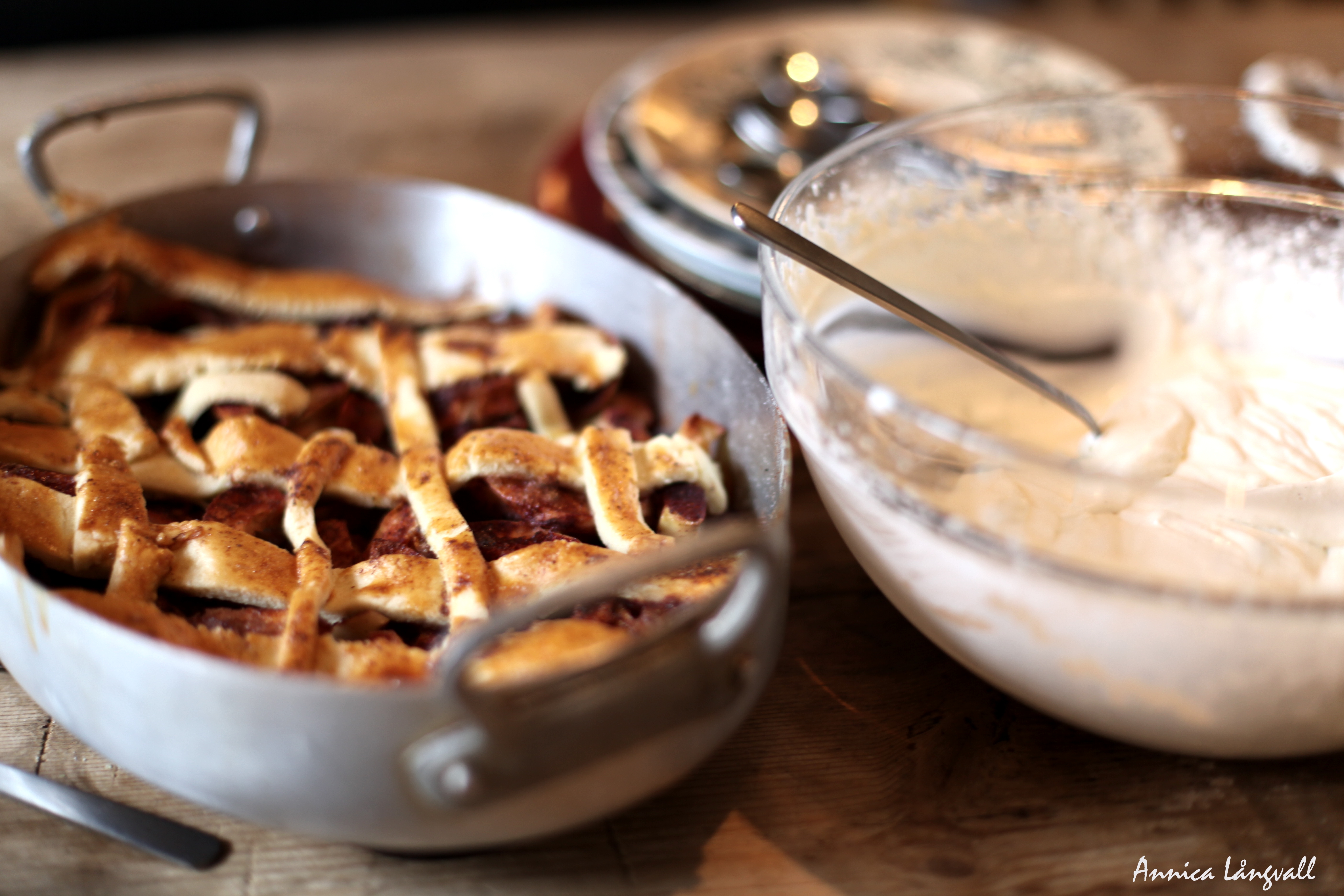 Äppelpaj med äpplen från mammas trädgård i Örnsköldsvik, och så vispad grädde med vaniljpulver.