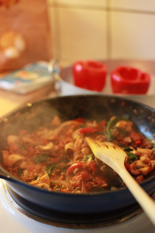 - Tillsätt bladspenaten och låt den fräsa med en minut. Tillsätt krossade tomater, färdiga röda linser, vitlök, balsamvinäger och honung och rör om. Låt koka ihop en liten stund. Smaka av med salt, peppar och balsamvinäger.