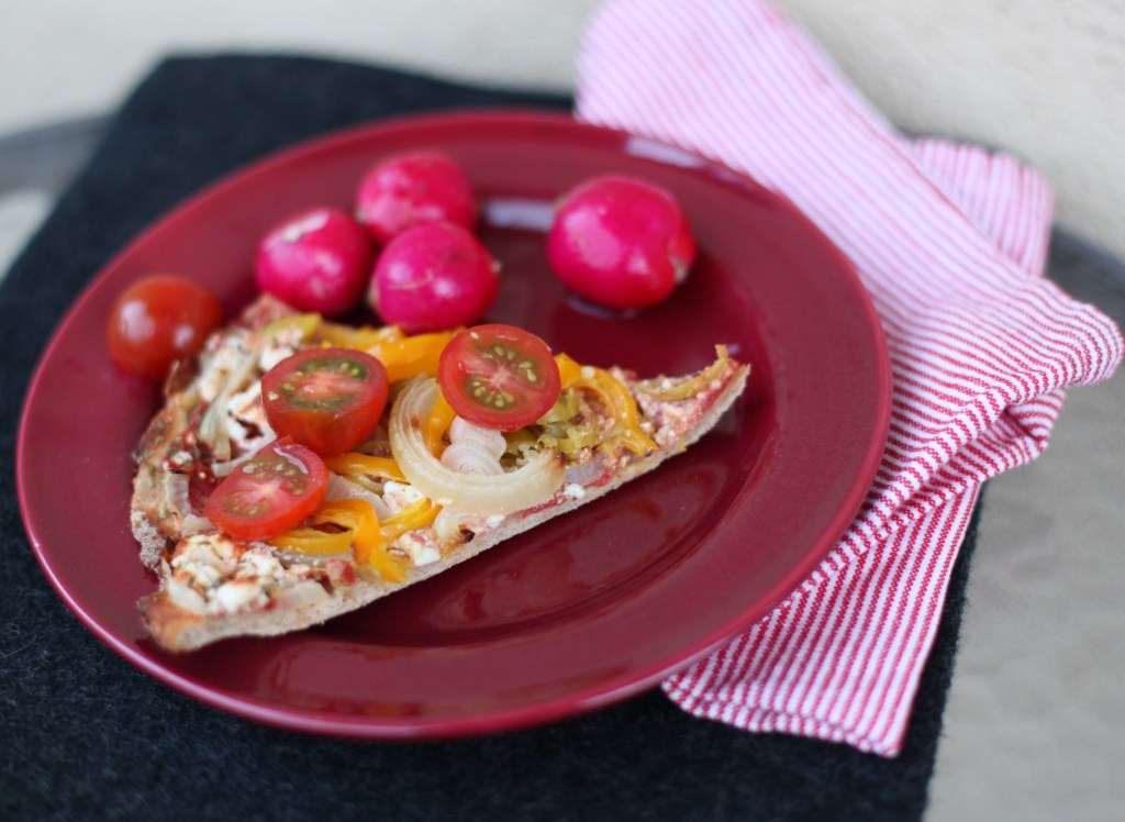 Min restpizza bestod av en fullkornsdeg med tomatsås, toppad med gul lök, en paprika som höll på att skrumpna, skinka som hade någon dag kvar före utgångsdatum, ett halvt paket fetaost som fanns kvar. Kvar i kylen från helgen fanns också lite rädisor och körsbärstomater som behövde ätas upp.