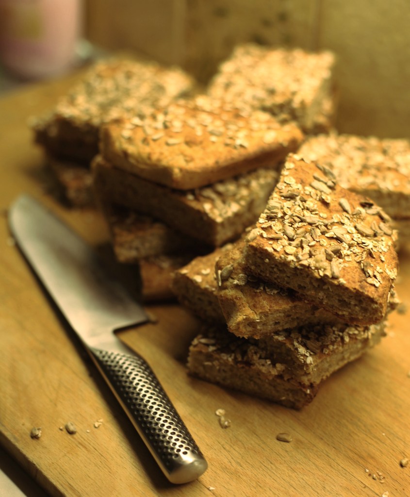 Att baka av gröt är ungefär som att baka av skållat mjöl. Det blir så saftigt. Det smidiga med långpannebröd är att man slipper knåda och rulla limpor och bullar. Snäppet smidigare alltså. Så om det blir gröt över efter helgfrukosten, passa på att fylla på brödförrådet!