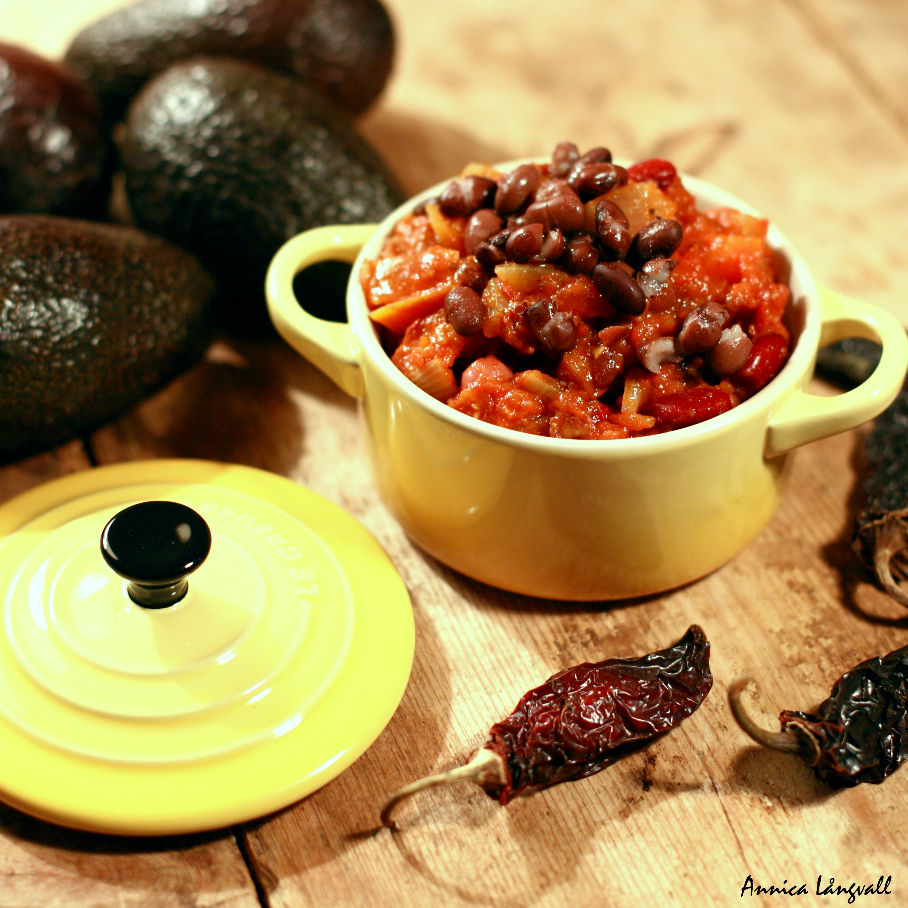 I en underbar kokbok av Anna och Fanny Bergenström läste jag en gång ett recept där det ingick chipotle, en rökt torkad chilifrukt som enligt vad jag förstår används en hel del i mexikansk matlagning, och ända sedan dess har jag varit sugen på att testa det. Nu har jag äntligen gjort slag i saken, och vilken hit det blev. Efter att ha malt den torkade chilifrukten till ett fint pulver med hjälp av vår kaffekvarn fick den sätta smak på en vegetarisk chili.