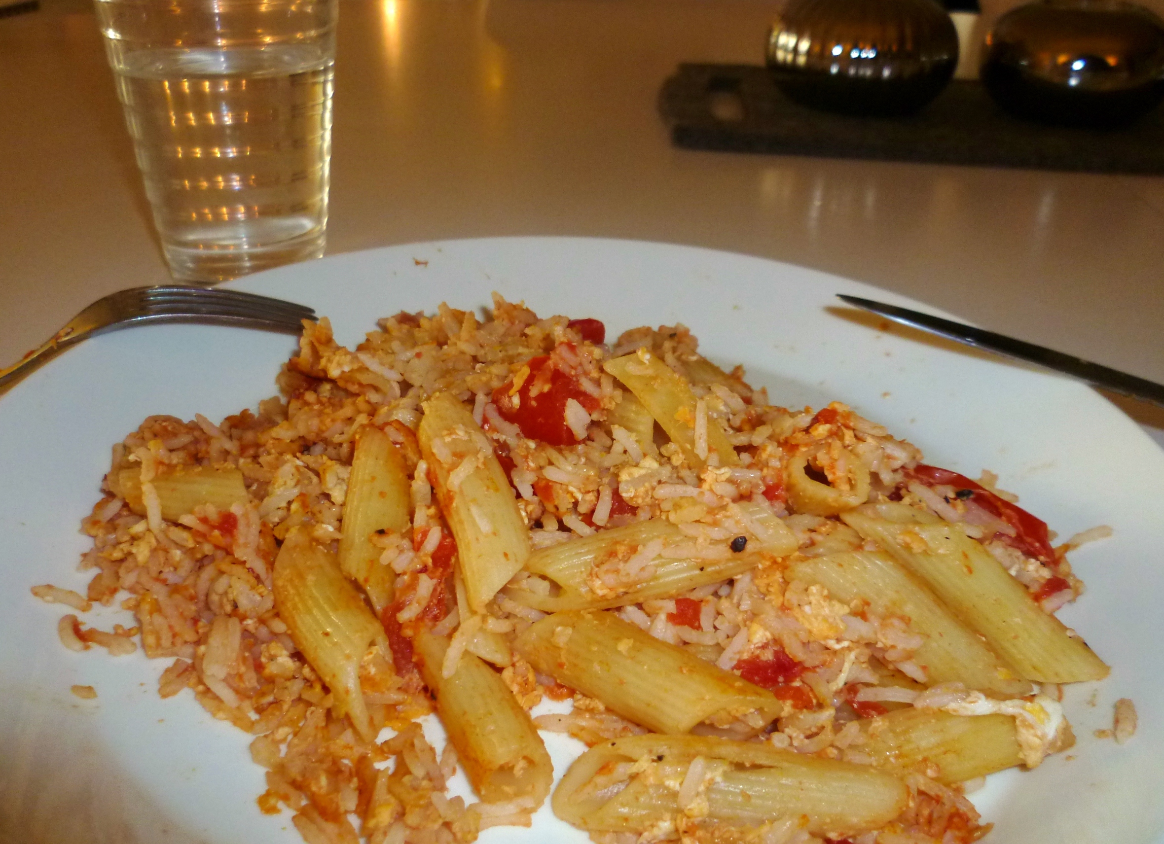 ”Tänkte komma med ett lunch-/middagstips som jag gjorde för några veckor sedan när hela kylen bestod av rester. Det vill säga, en halv portion kokt ris, en halv portion kokt pasta och en öppnad burk tacosås som väl skulle börja mögla när som helst. Bestämde mig för att woka allt i en wokpanna tillsammans med ett ägg och lite soya. Faktiskt väldigt gott! Om man skulle vilja tillföra lite mer protein skulle man säkert kunna röra ner lite skinka eller färdigstekta kycklingbitar. Eller något helt annat. Bara fantasin som sätter stopp! Sänder med en bild på min lunchtallrik.” Tips och bild av Rebecca på http://backaintepaback.bloggsida.se/)
