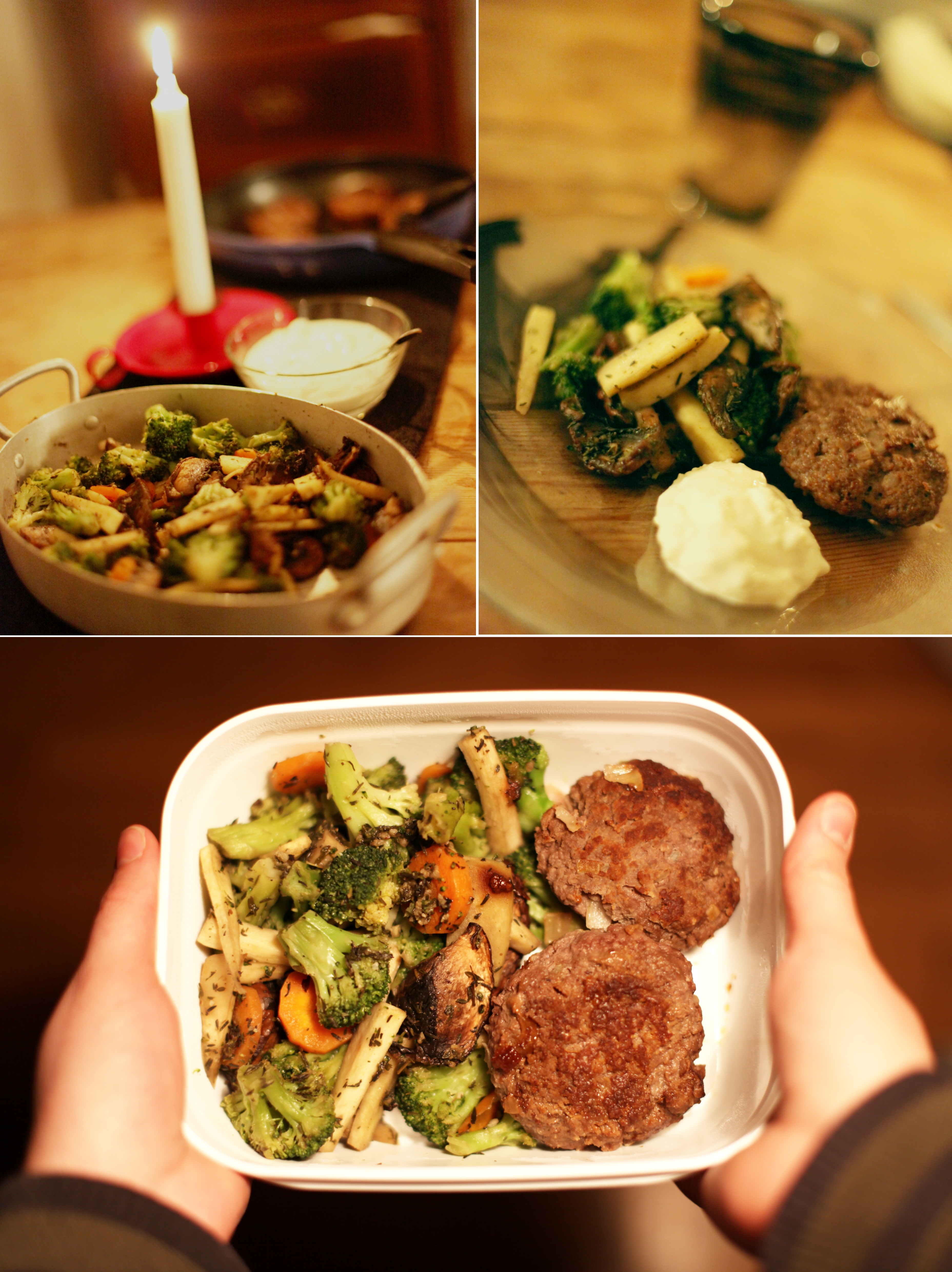 Gör biffar av färs, (schalotten)lök med en skvätt matlagningsgrädde i om du har. Stek och servera med rotsakerna och en sås som du blandar ihop av turkisk yoghurt och smulad fetaost.