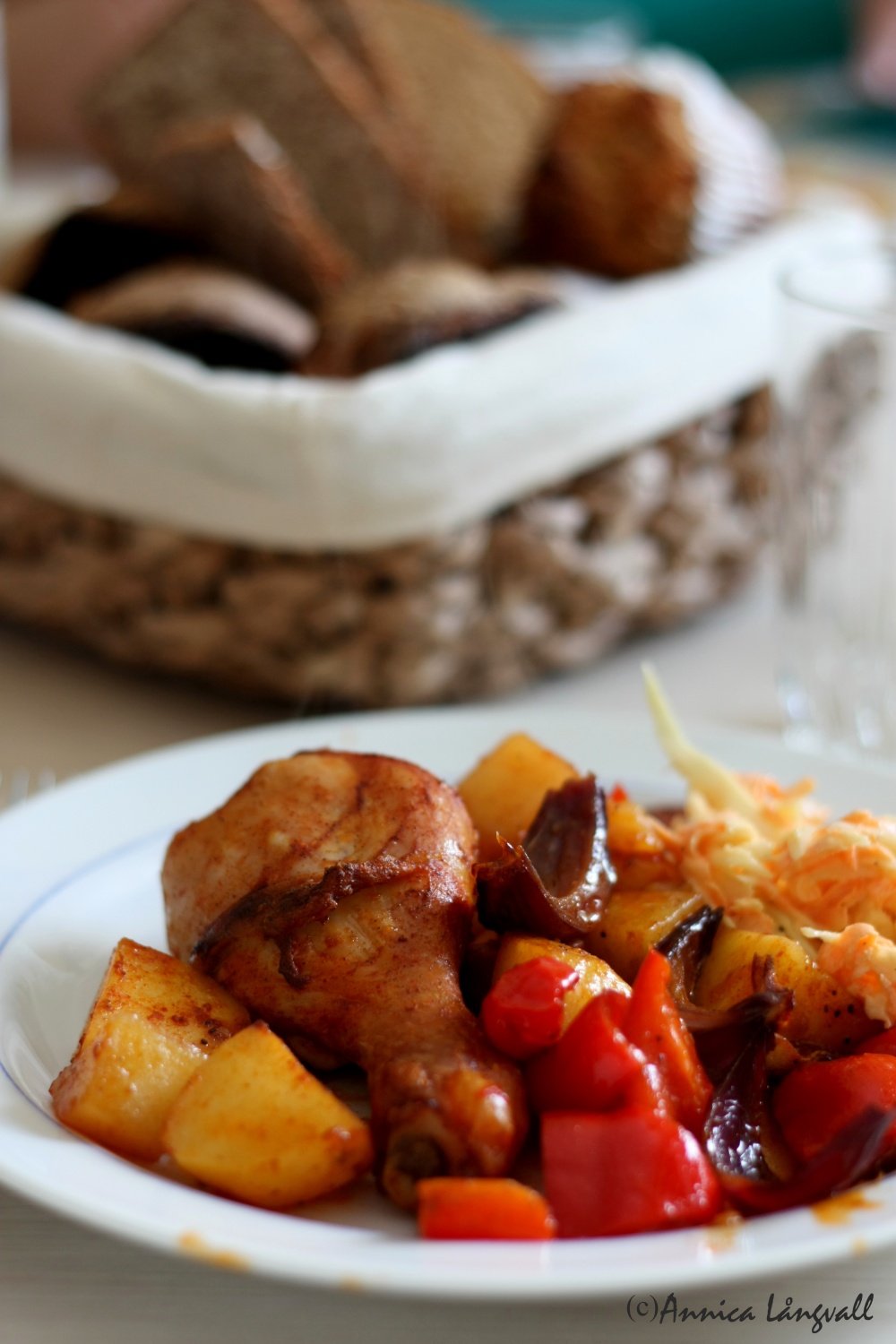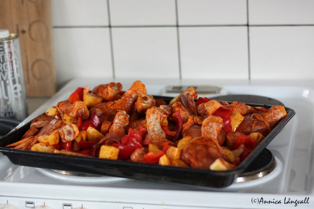 Jag brukar hitta färdigkryddade färska kycklinglår för ca 50 kr/kg som jag använder till den här rätten. Kycklingen brukar då vara kryddad med bland annat paprika och vitlök, vilket passar perfekt in i den här rätten! Det går såklart bra att använda andra kycklingdelar och krydda även dem själv.