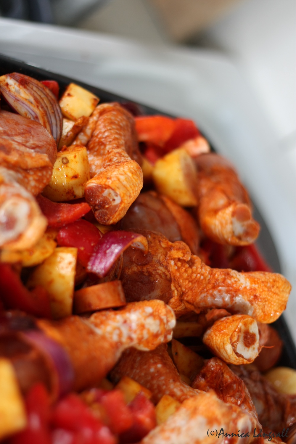 Jag brukar hitta färdigkryddade färska kycklinglår för ca 50 kr/kg som jag använder till den här rätten. Kycklingen brukar då vara kryddad med bland annat paprika och vitlök, vilket passar perfekt in i den här rätten! Det går såklart bra att använda andra kycklingdelar och krydda även dem själv.