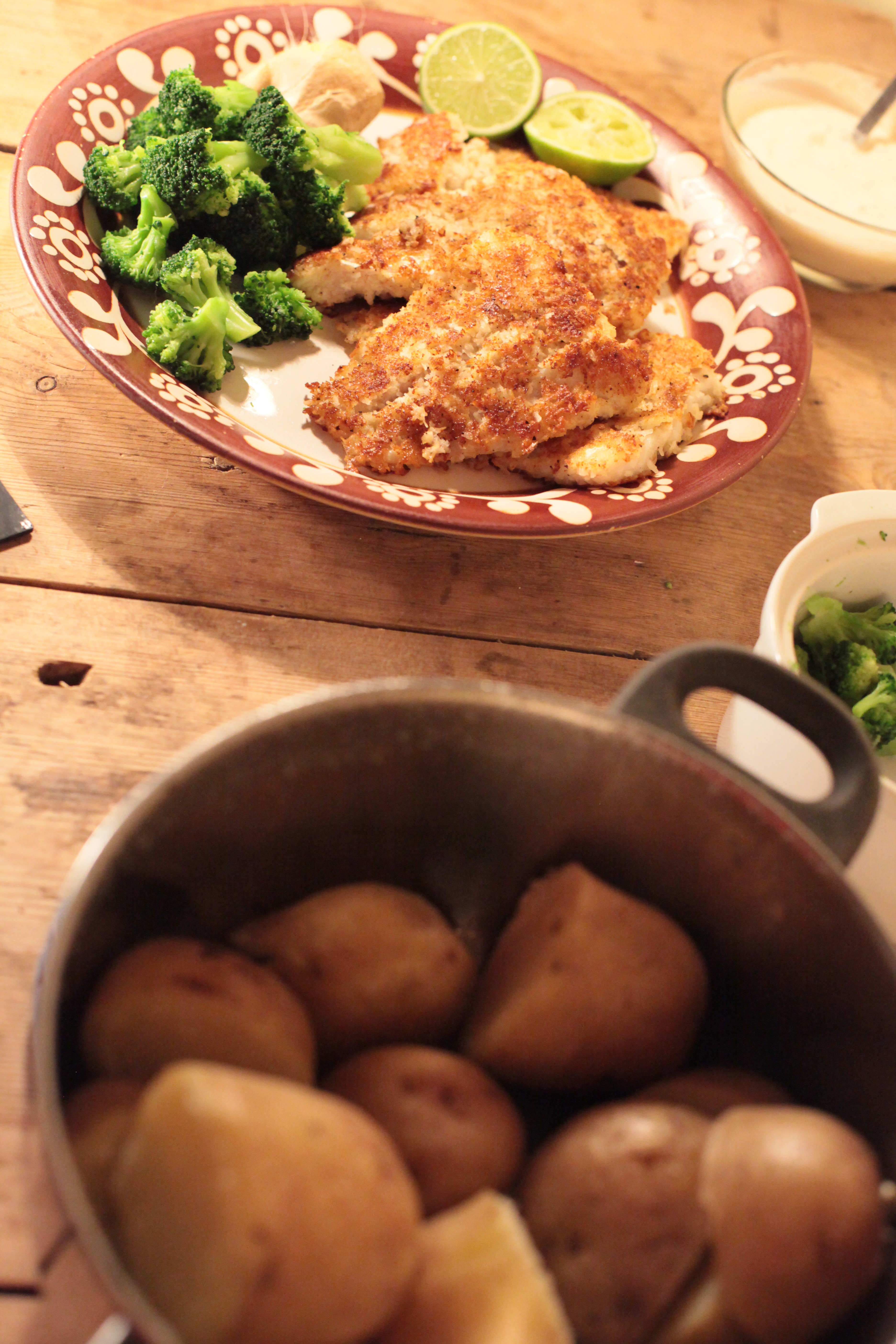 Kokospanerad fisk med ingefära, potatis och yoghurtdressing