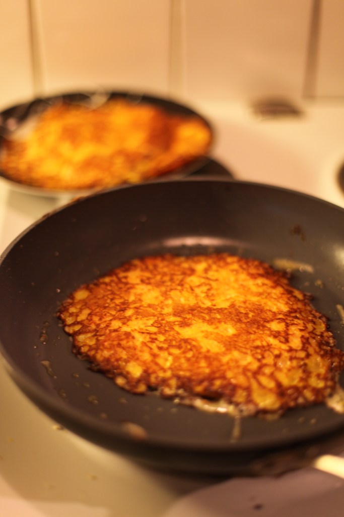 - Värm en stekpanna till medel – hög värme, tillsätt matfett och stek raggmunkarna på båda sidor tills de får fin färg, ca 1 dl smet per raggmunk.