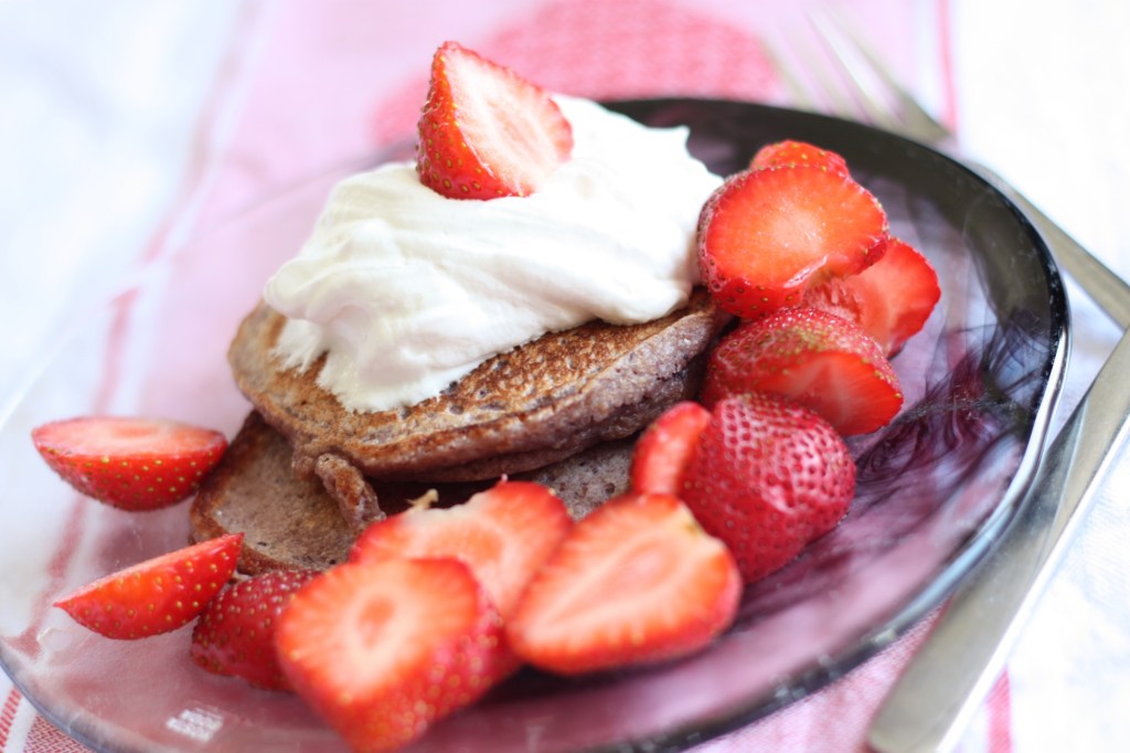En mjölkfri frukostpannkaka som jag trixade till i somras. Åh, jordgubbar. Åh sommar…