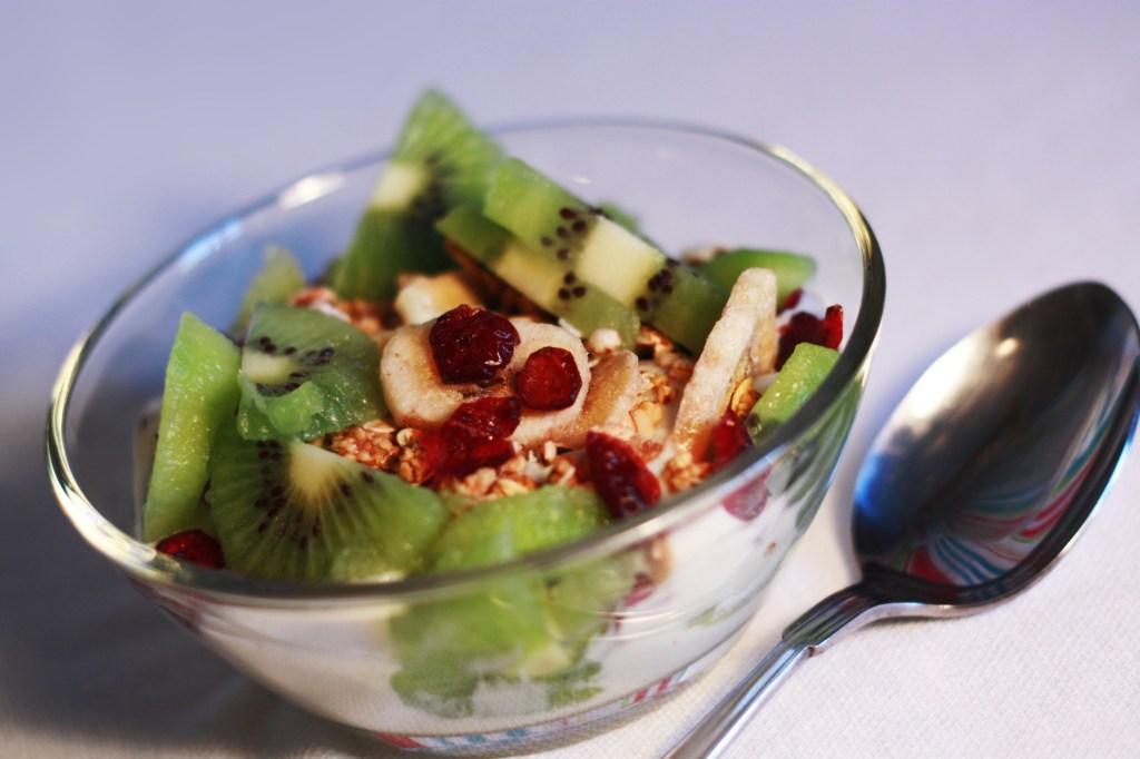 Jag tog 1 dl havregryn, 1/2 msk linfrö, 1 dl vatten och 1 dl berikad sojamjölk. I det klippte jag ned torkad mango och så smaksatte jag med lite salt och vaniljpulver. Jag drog plastfolie över, och nu får det stå till imorgon bitti. Då tänker jag ta fram det en stund så att det får rumstemperatur – eller så sätter jag in den i mikron en liten snabbis.. Jag har också tagit fram lite bär och frukt från frysen som får tina över natten så jag har någon topping.