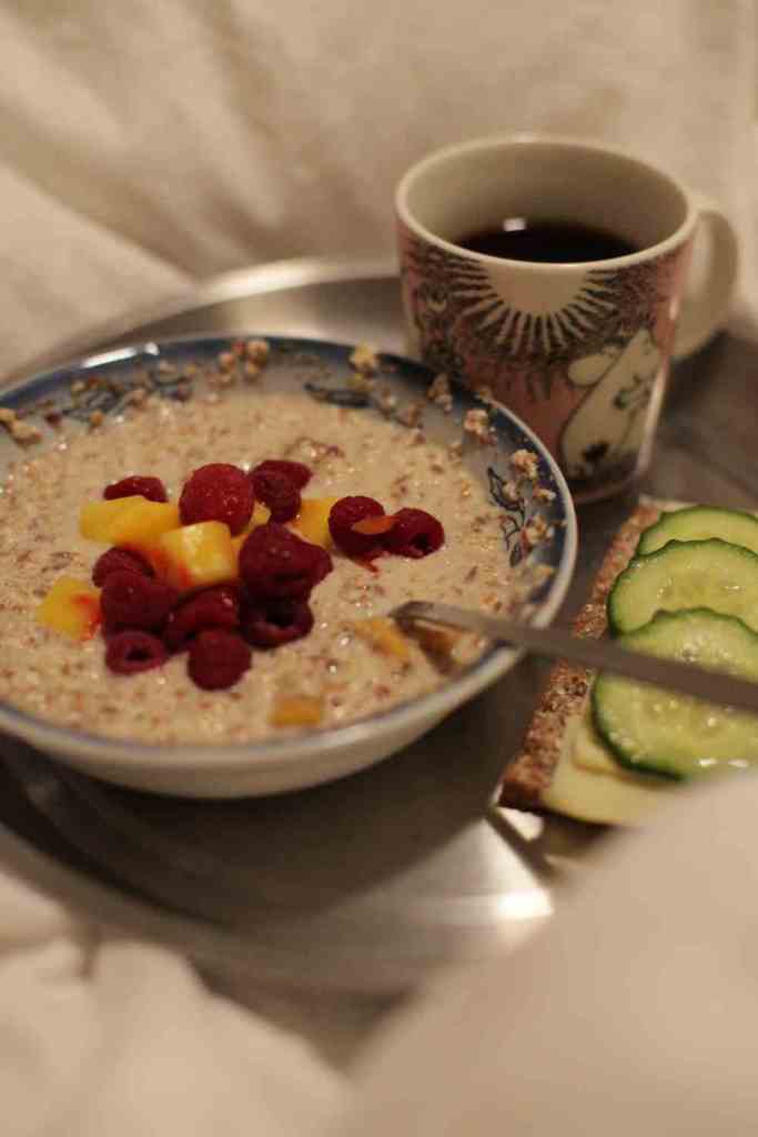 Just nu sitter jag och mumsar på resultatet av mitt försök att göra overnight oatmeal. Med några små justeringar i planen blev den helt ok: gröten blev lite för lös så jag tillsatte lite mer havregryn. Känslan av att äta kall gröt lyckades inte riktigt värma upp mitt mathjärta, så gröten fick åka in i mikron en minut så att den i alla fall blev ljummen. Och sen toppade jag den med bären och en matsked matlagningsgrädde…. Jag såg några engelska recept där gröten fick koka svagt på spisen under natten. En sån tillagningsmetod ger en helt annan effekt – men kanske skulle den passa bättre om man gillar varm gröt? Tål att testas.