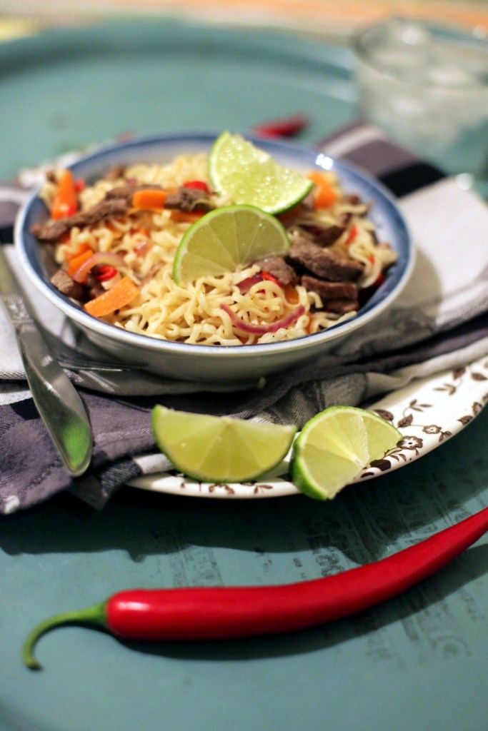 Wokad lövbiff med lime, chili, vitlök och nudlar