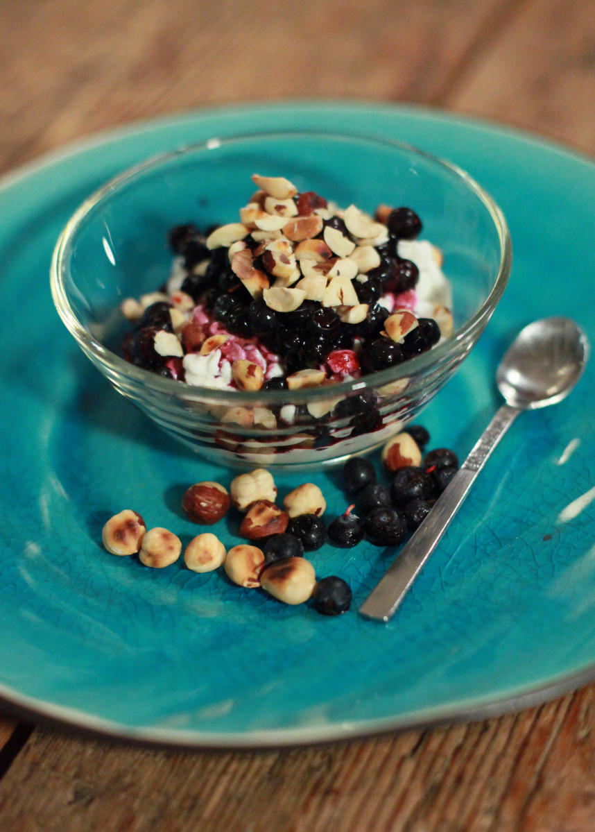 Toppa keso med färska eller frysta lätt tinade blåbär. Hacka hasselnötter grovt och strö över. Klar att avnjutas!