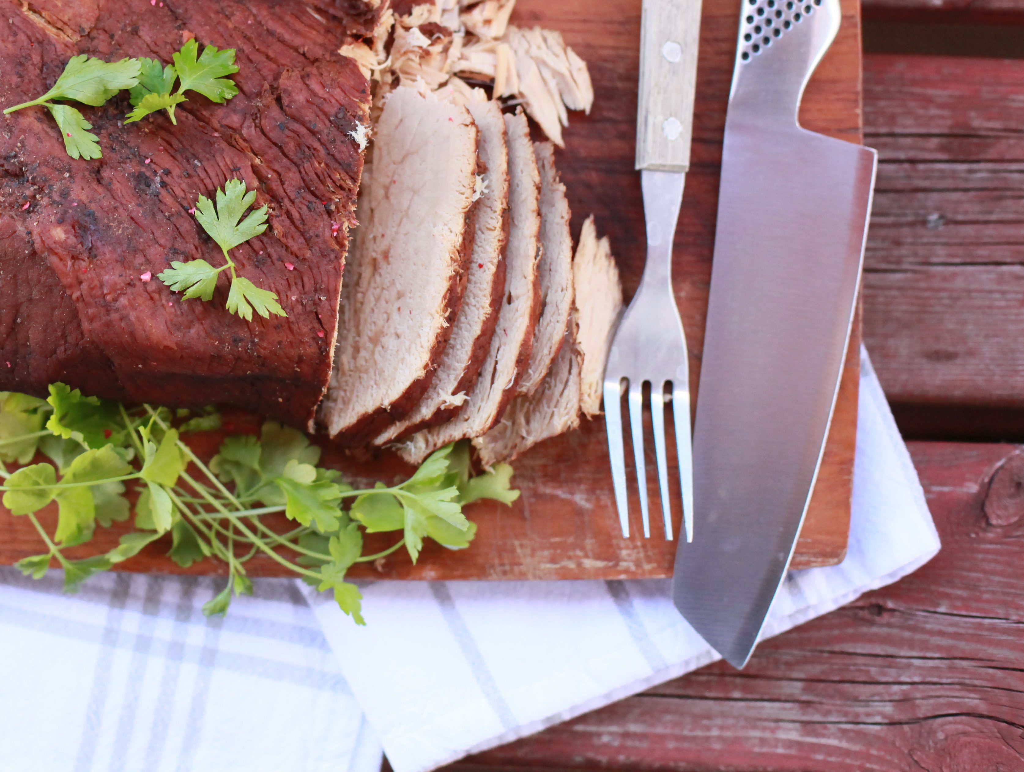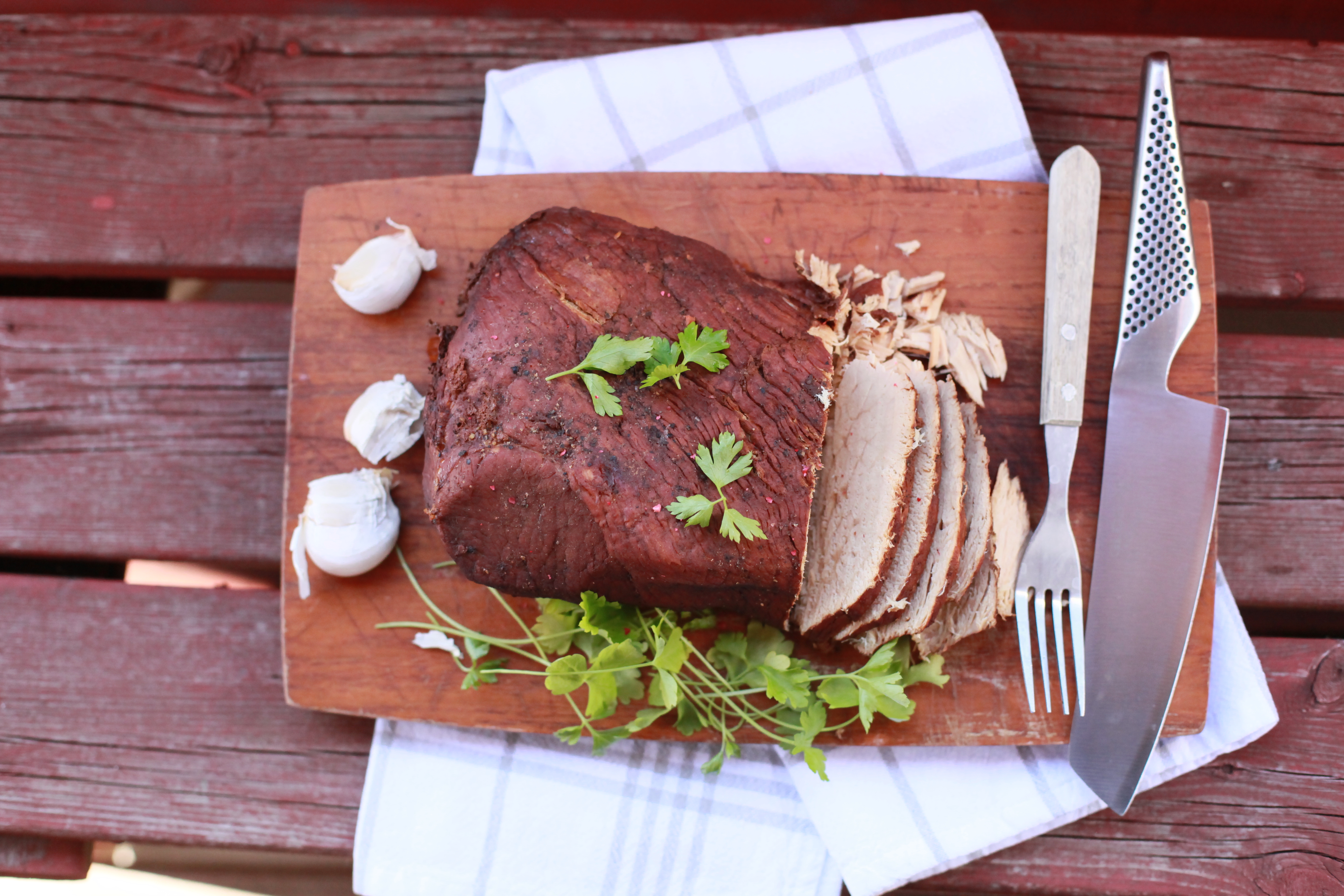 Koka upp vätskan och smaka av så att den smakar ordentligt mycket. Sänk temperaturen och låt steken koka i vätskan i några timmar. Min stek fick ligga ca 4-5 timmar. Vänd på steken efter halva tiden.